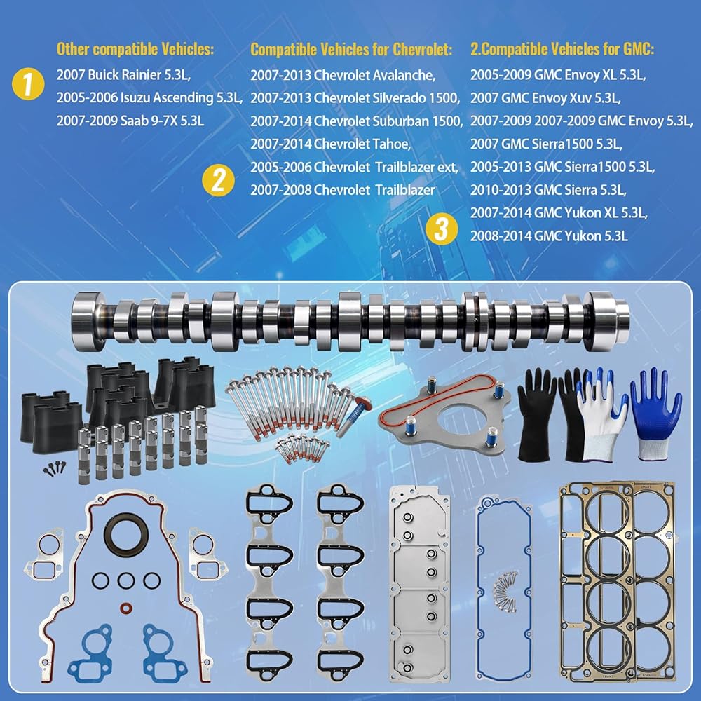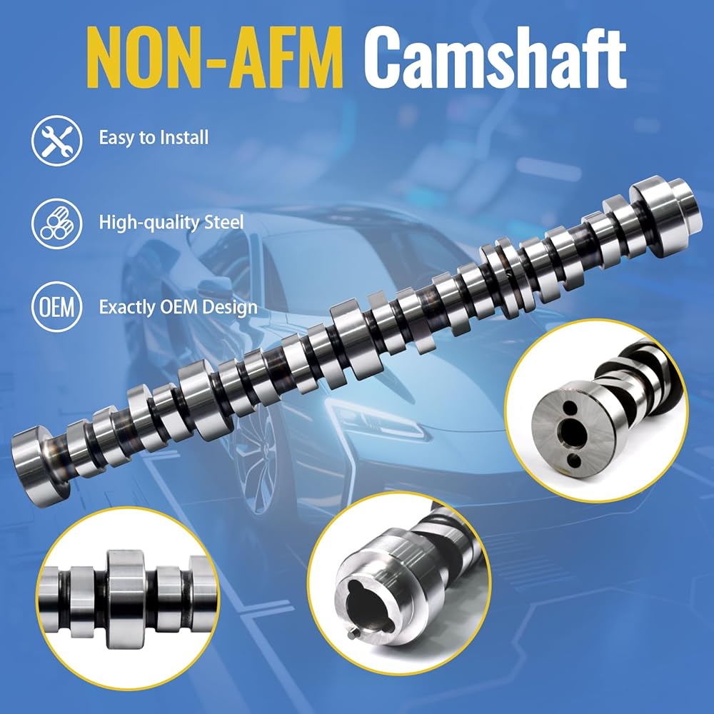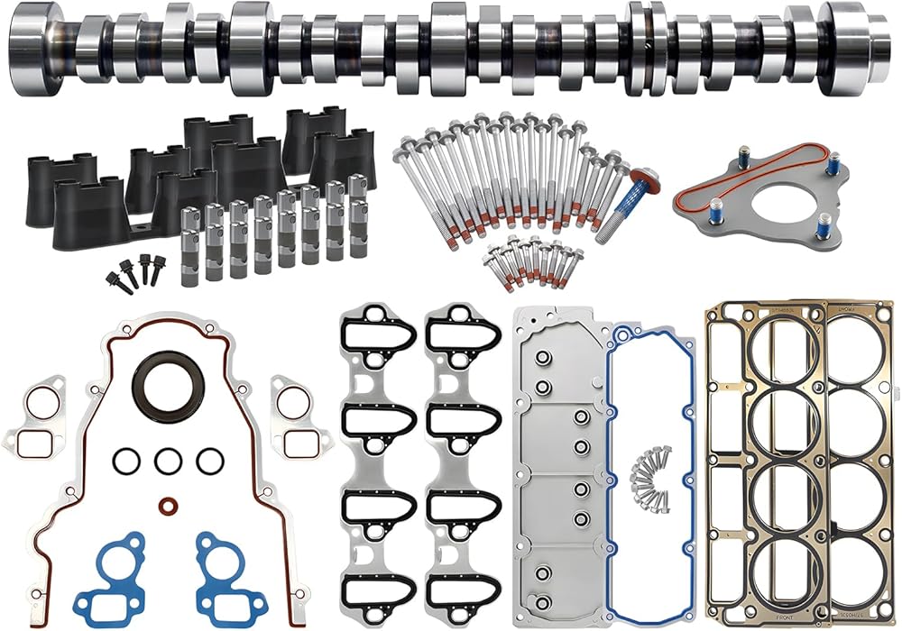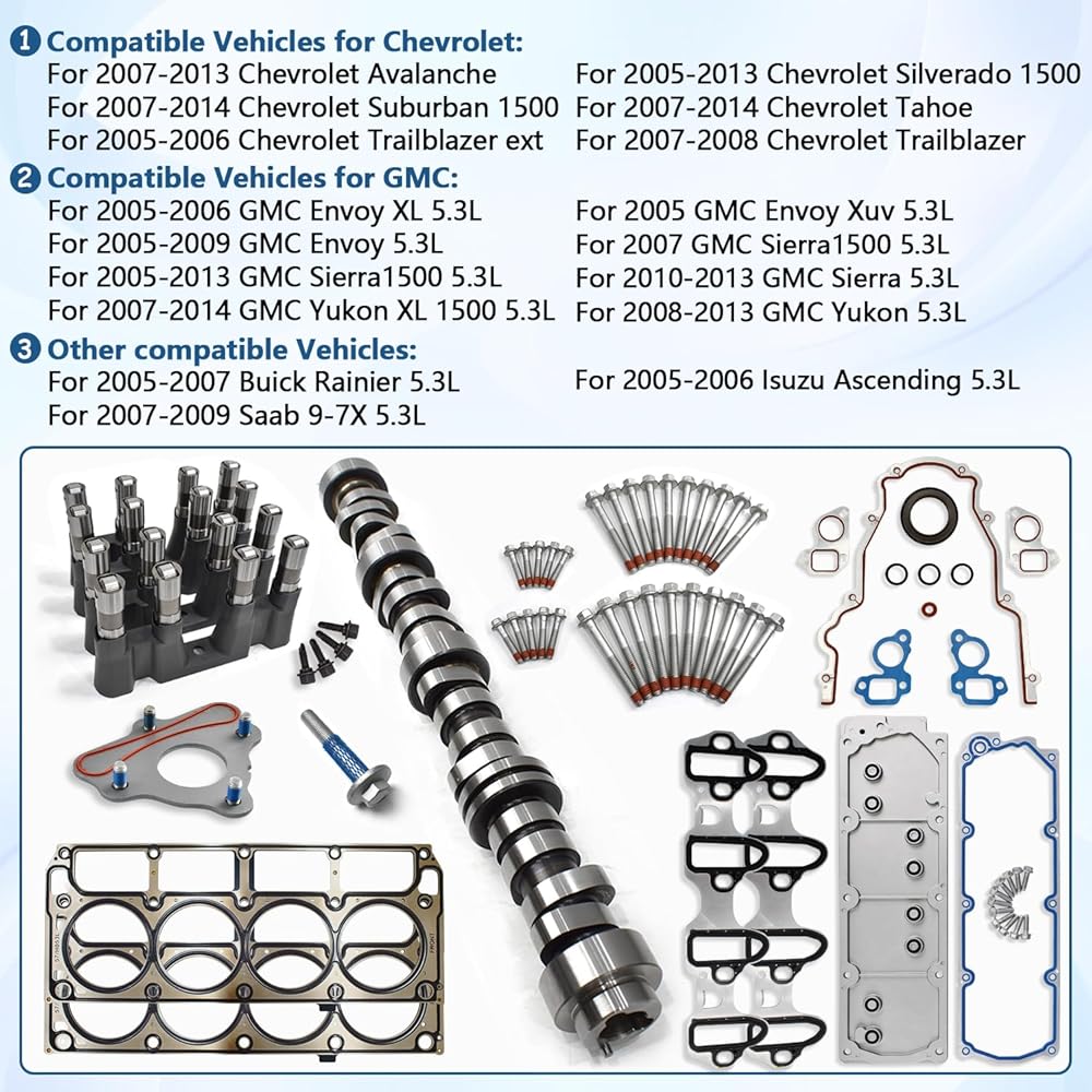 🚗High- Performance Package Include: 5.3L NON-AFM basic kit includes-- Camshaft kit, Thrust plate x1, NON-AFM hydraulic roller lifters x16, Timing cover gasket x1, head gasket x2, Timing Chain x1, oil pump x1, water pump x1, Valley Cover Gasket x1, Cylinder head bolts x30, Crankshaft screw x1