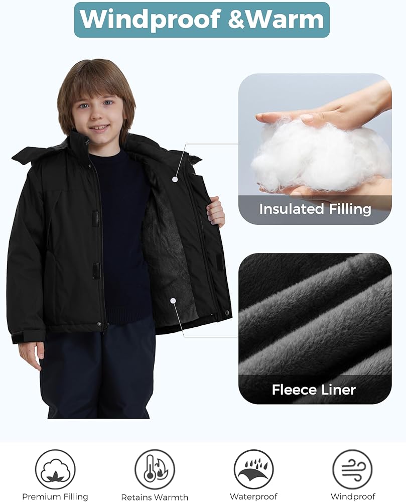 Fleece Rain Jackets Boys Will Love - Keep your child dry on rainy days with our teens snow coat - a waterproof winter jacket for kids with a level of 10000mm H2O to protect from precipitation. It's an ideal piece of clothing for picking up children during rainy days, playing in the snow, or running during foggy mornings.