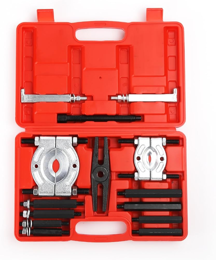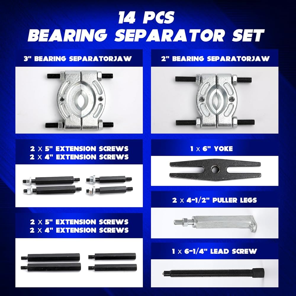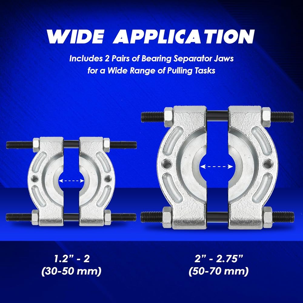 Bearing separator set:Comprising a 3" and 2" bearing separator jaws, a 6" yoke, a 6-1/4" forcing screw, along with multiple 4" and 5" extension screws and two 4-1/2" L-type legs, it's your one-stop solution for diverse pulling tasks.