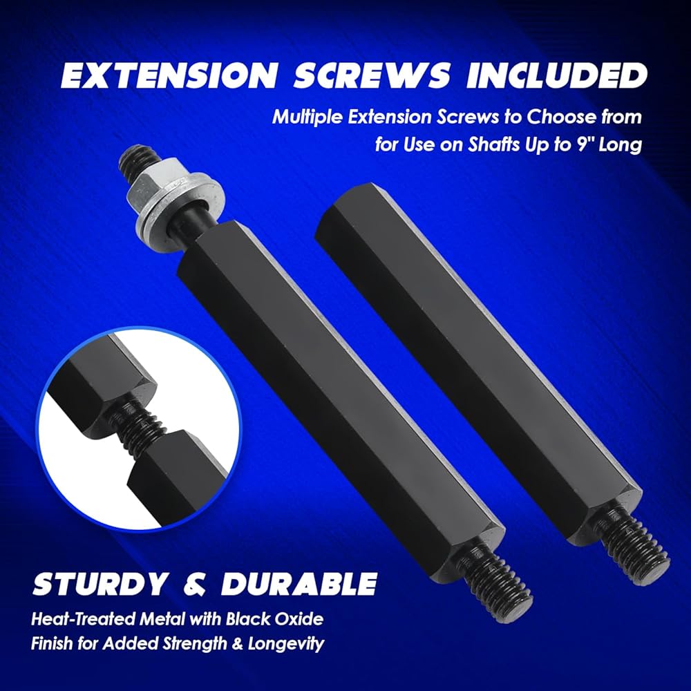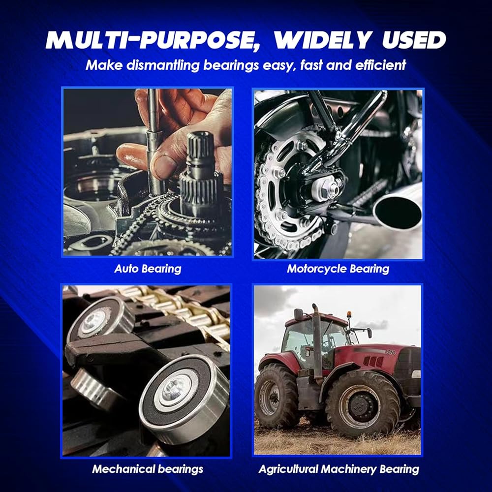 Bearing Puller Set:It effortlessly removes bearings of various sizes from front and rear wheel hub axle shafts, as well as from components like gears, pulleys, and steering wheels, making it a must-have for any toolkit.