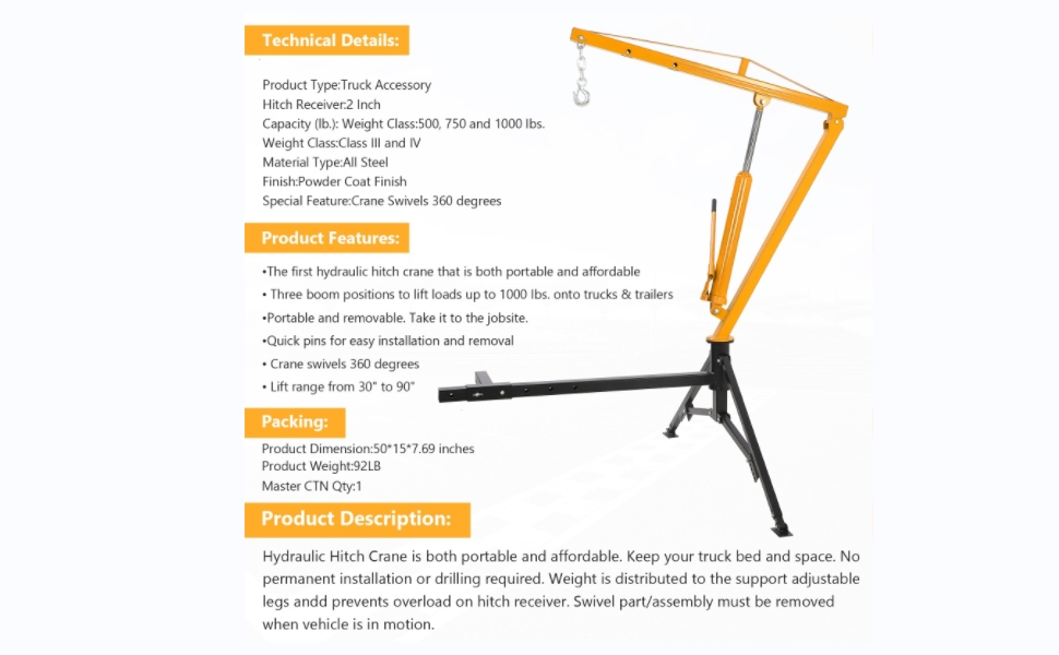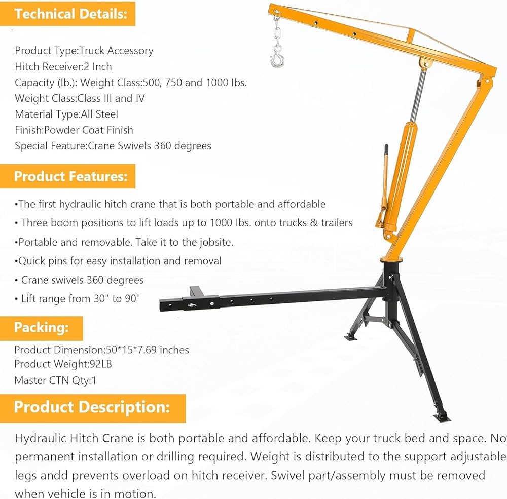 Versatile Lifting Capacity:This truck hitch crane is capable of supporting a range of weights from 500 lbs to a maximum of 1000 lbs, making it suitable for diverse lifting requirements. It is ideal for heavy-duty tasks that demand dependable lifting performance.