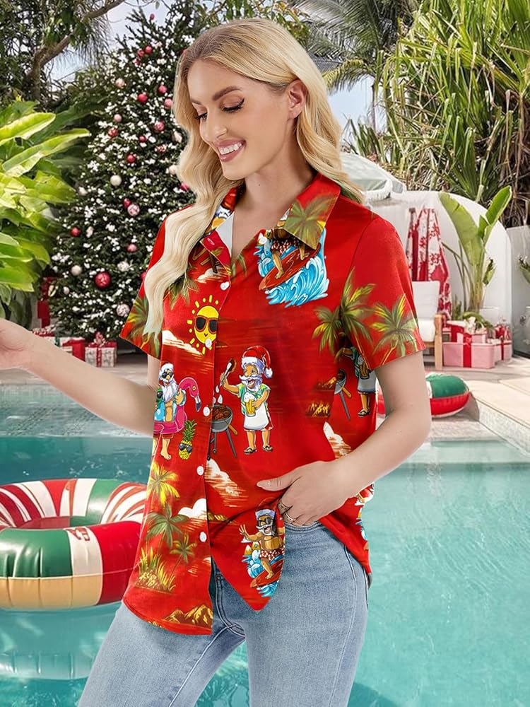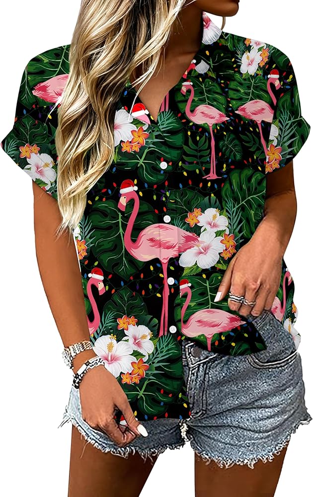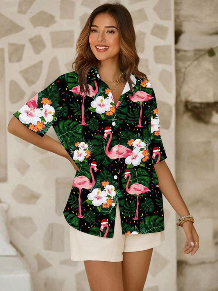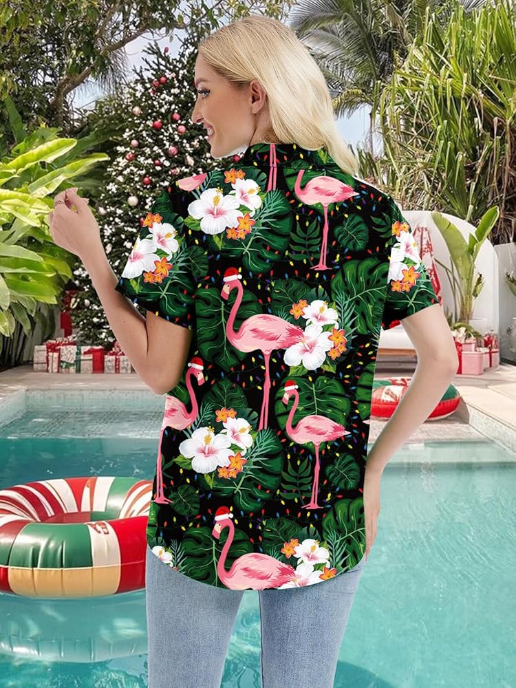 Unique Design:Tropical Print with flamingo ,palm trees and santa claus,which creat a casual and cheerful vibe.The classic hawaiian style combine with chrismas elements let you feel the festavel atomosphere in summer