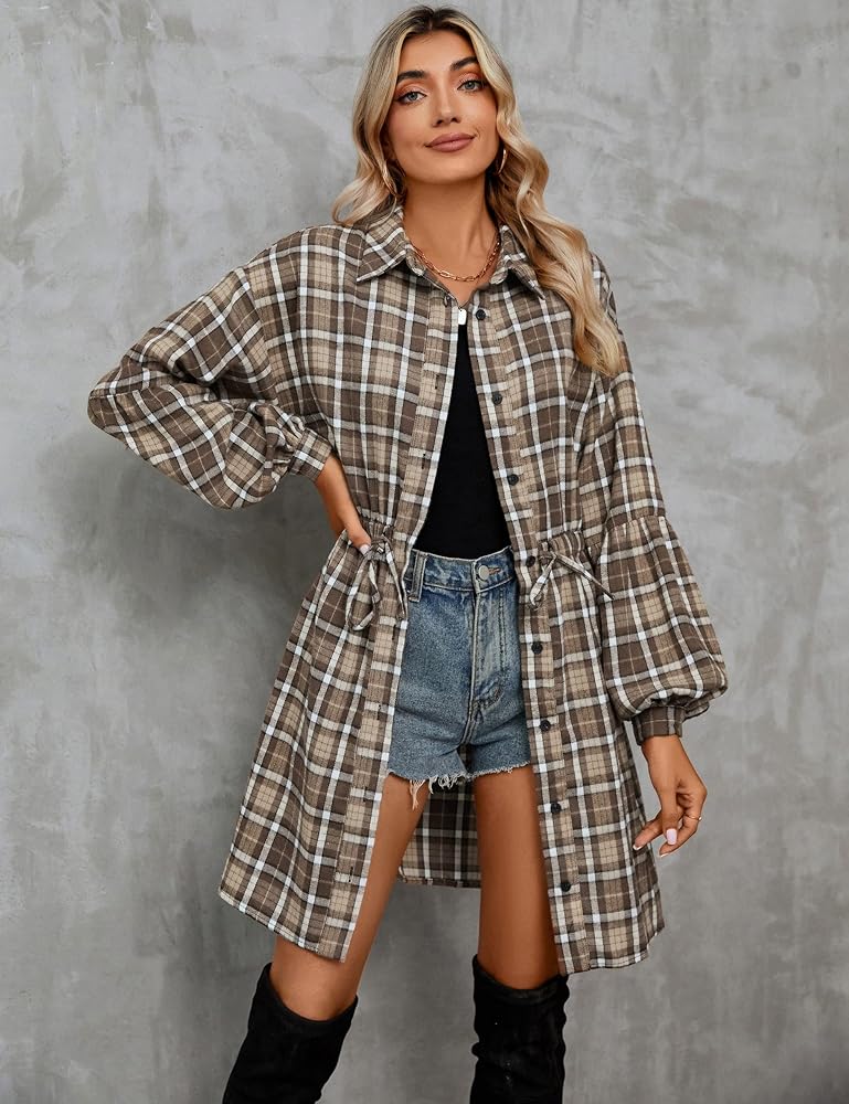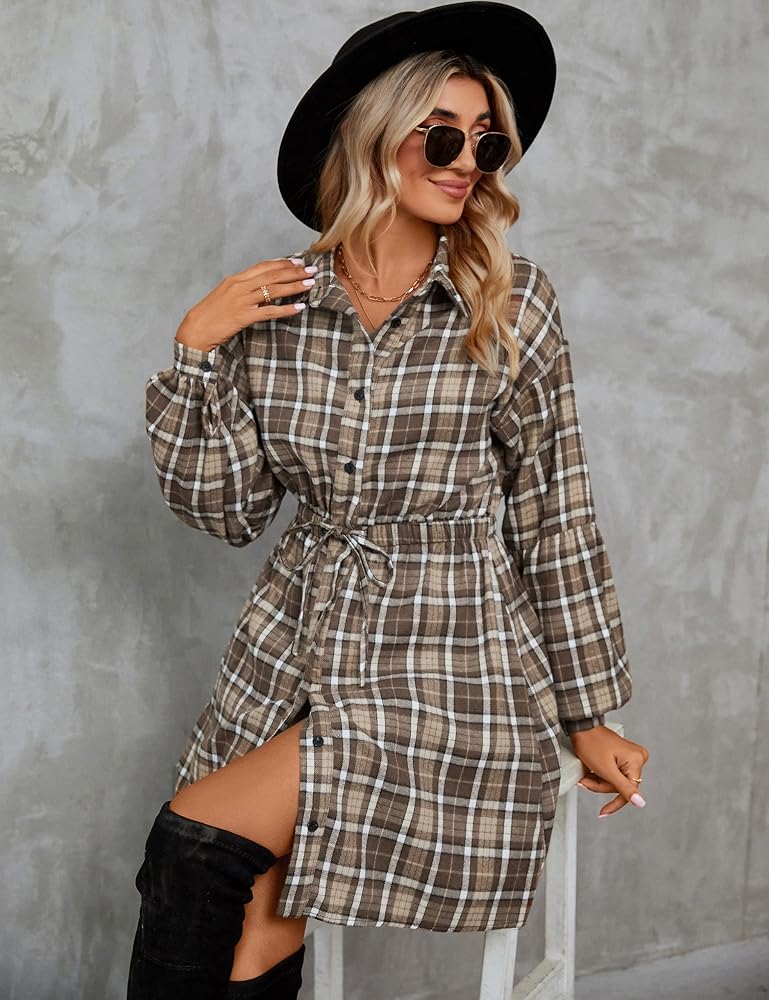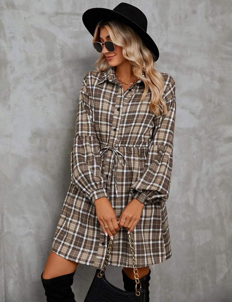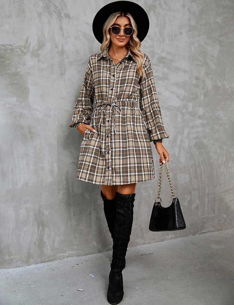 Features: This plaid dresses for women featuring trendy puff sleeve,turn-down collar, unique drawstring waist belt, two side pockets, close to knee length, flannel dress is classical and elegant, also the great piece for fall fashion.