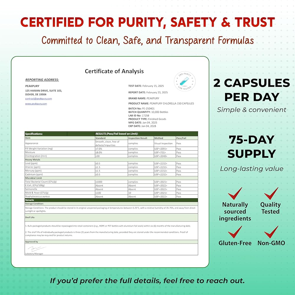 With just 2 capsules a day, you get a 75-day supply—a convenient, long-term companion to your wellness journey. Made in GMP-certified facilities with clean ingredients and no unnecessary fillers, PeakPury Chlorella is your reliable daily support for ongoing vitality and balance.