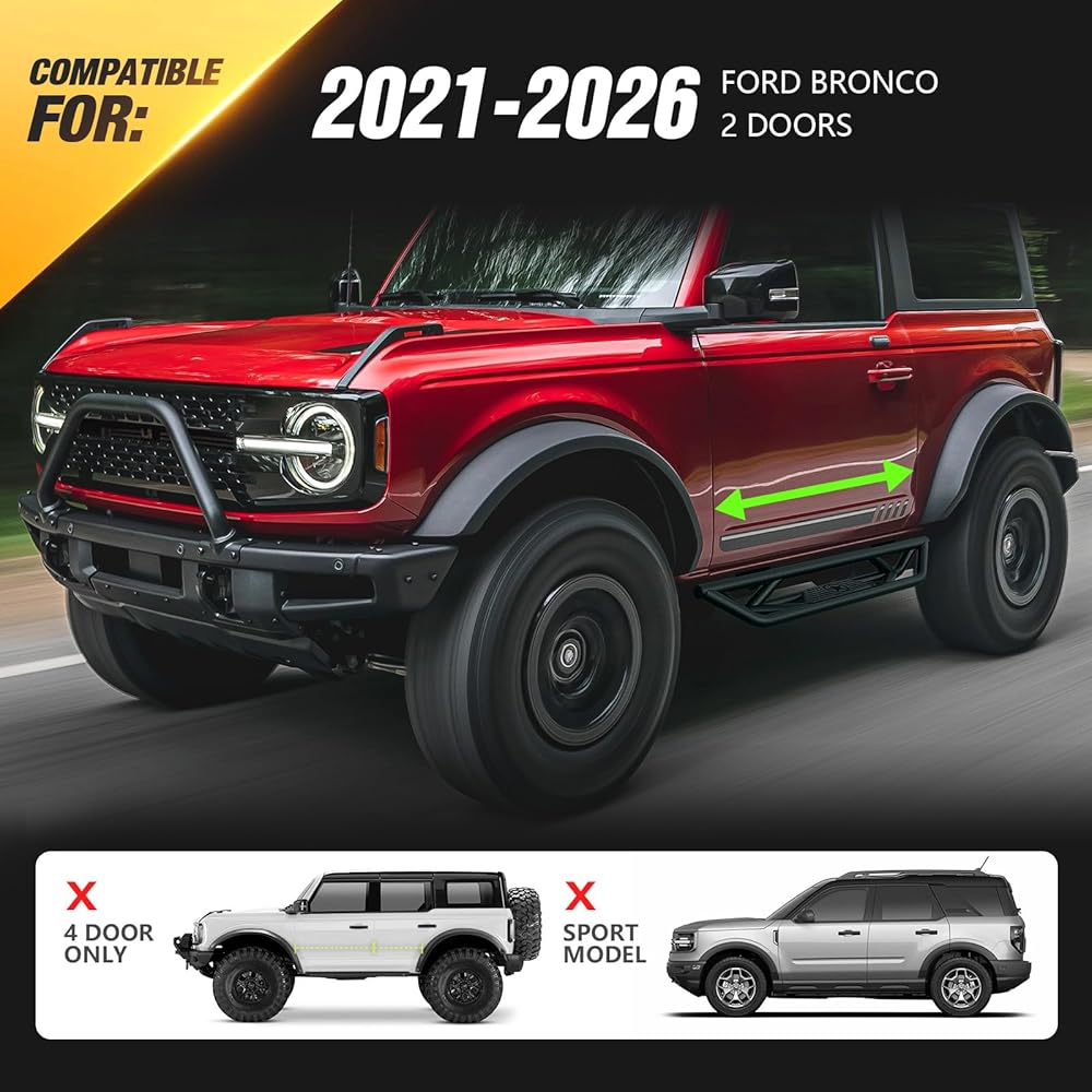 YZONA for Bronco Running Boards Compatible with 2021 2022 2023 2024 2025 2026 Ford Bronco 2 Doors (Not for Sport Model), Heavy-Duty Steel Side Steps Nerf Bars Bolt-on Step Plates Rock Sliders Rail