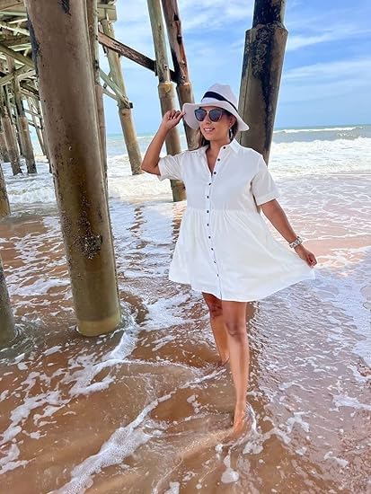 💓Versatile: Womens babydoll dress can literally be worn with leggings, jeans, jean jacket, tank shirt, over swim suit, flip flops, over the knee boots, wedge booties, medium heeled slides, fringe earrings, gold bangles, belt and so on. This short sleeve button down dress is flattering and easy to dress up.