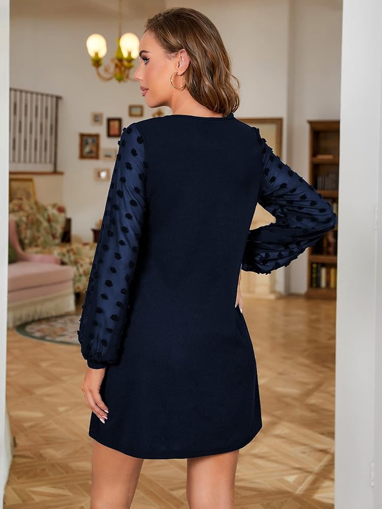 - Mesh lantern sleeve, round neck, swiss dots embroidery, above the knee length, solid color