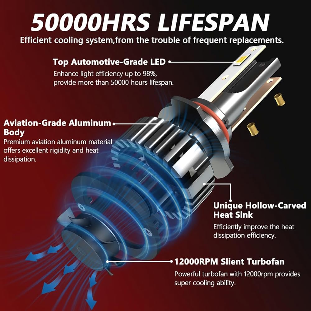 【50000 Hours Long Lifetime】IHNZCB's 9005/HB3 H11 LED headlight bulbs with aviation aluminum body design and IP68 waterproof technology,built-in cooling fan for optimal heat dissipation of LED light beads, ensuring 200% more cooler than LED bulbs without a fan,reduces light decay, and extends service life up to 5.5 years.
