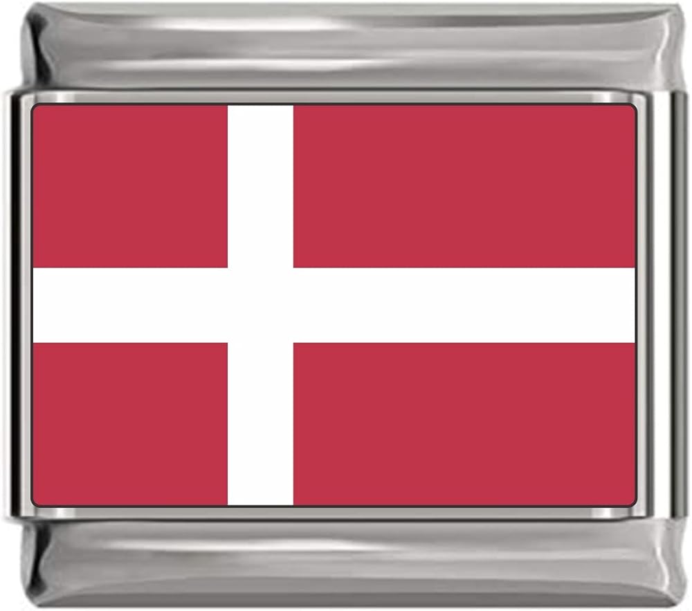 Denmark Flag Italian Charm Bracelet Jewelry Link. This high quality Italian Charm is compatible with our entire Italian Charm line as well as with all other major brands. Start with a few unique designs and build up to a full bracelet of unique charms over time. These charms and the bracelets they create make great gifts for a birthday, graduation, Mother's Day, and more.