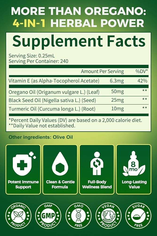 4-IN-1 HERBAL BLEND FOR COMPLETE SUPPORT: Oregano oil(Aceite de oregano), black seed oil, turmeric, and vitamin E infused in olive oil for better absorption and digestive comfort. Designed for full-body wellness, naturally.*