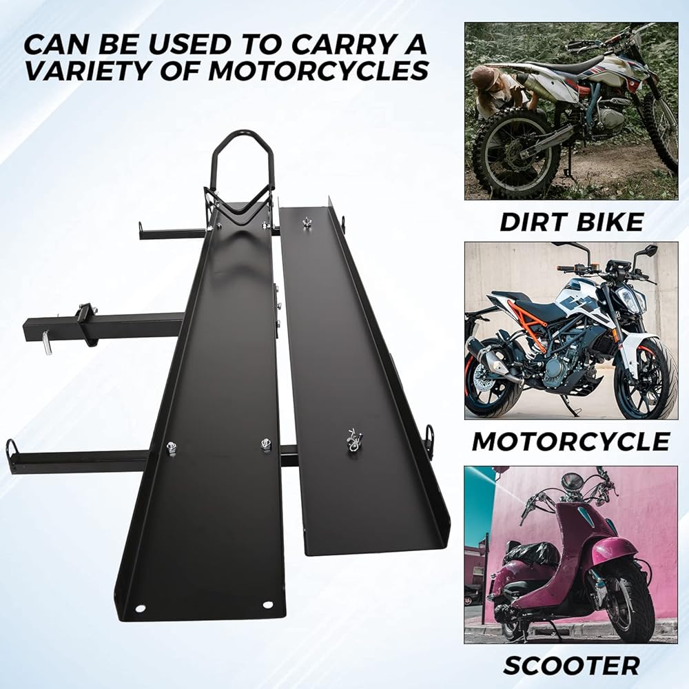 Strong Support: This is a great way for you to transport motocross bike, scooters and off road dirt bikes. The motorcycle carrier's heavy-duty steel frame makes it reliable and gives it strength and durability. The scooter trailer is portable in design and features a ramp, making it easy to load your bike onto the carrier