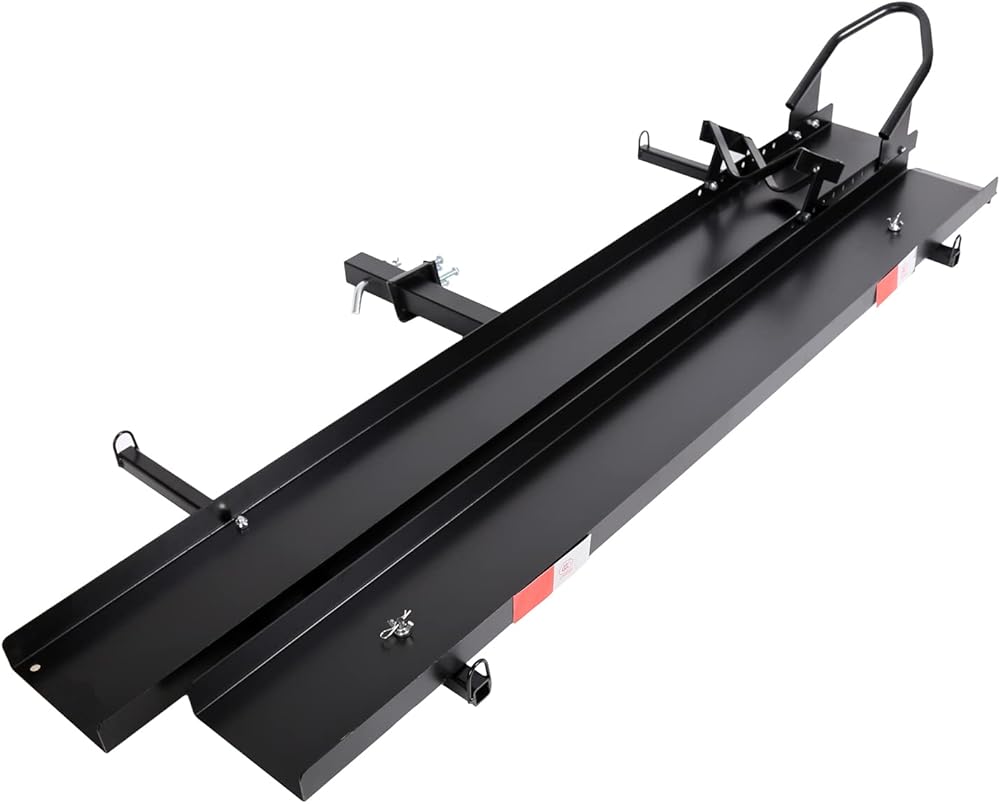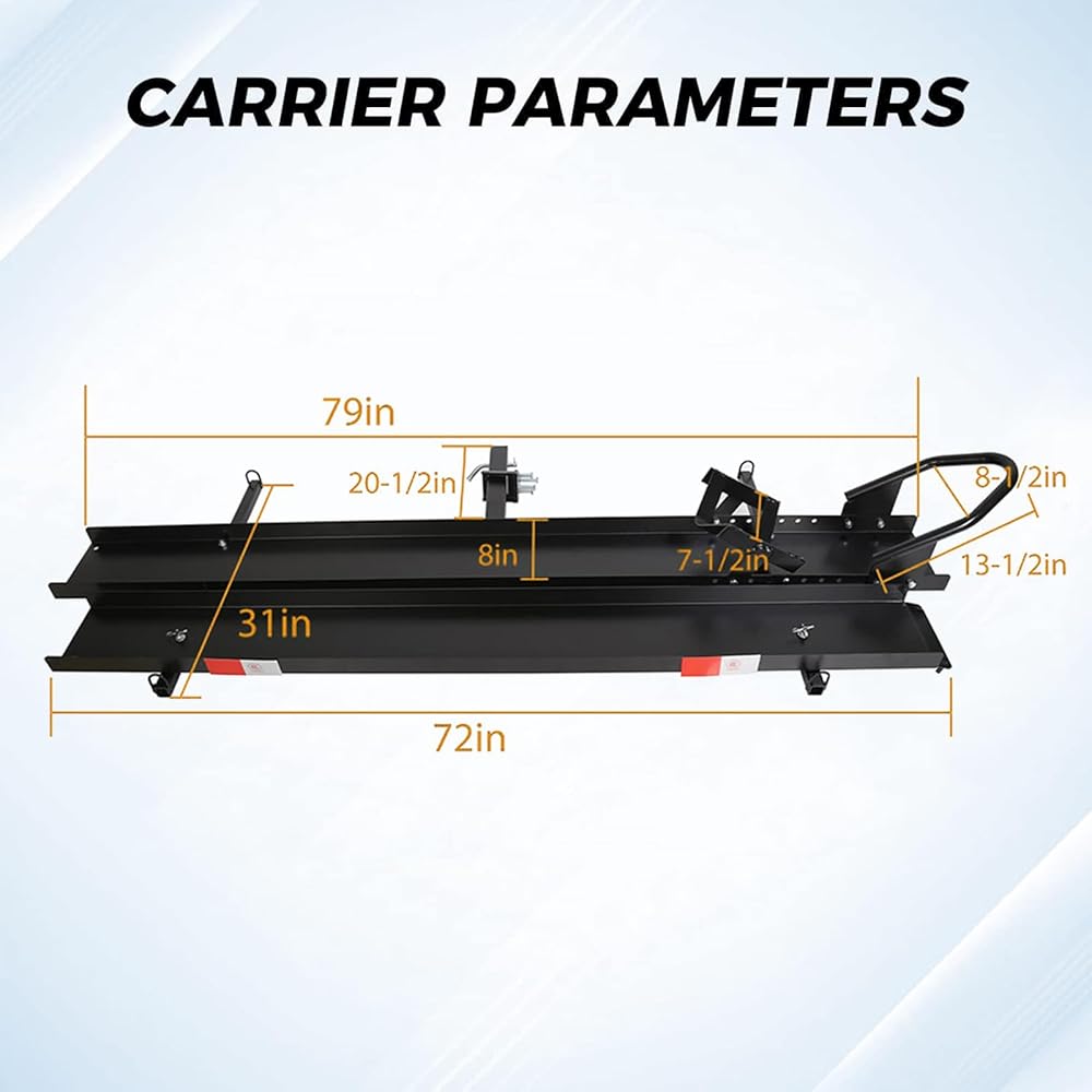 Carrier Parameter: Mounts using your vehicle's 2" receiver, hitch pin included with is 3/4". Rail is 79" long with a raised adjustable wheel stop that serves as a stabilizing wheel chock. Carrier Track: 79"x8". Loading Ramp: 72"x7.5". Weight Capacity: 600 lbs