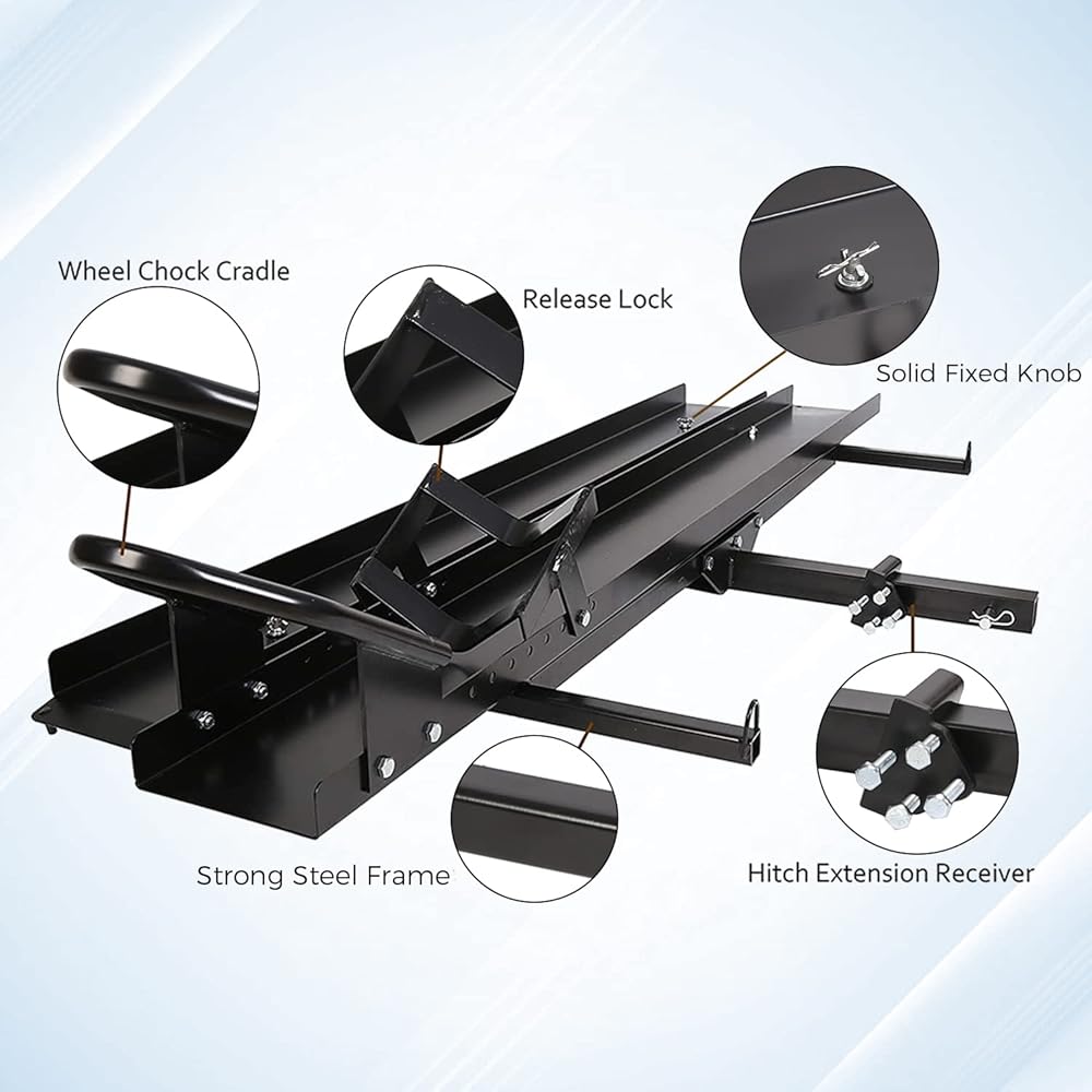2 Quick Release Lock: Equipped with 2 quick release lock which will help fasten your bike. Bumpy hills will not concern you anymore during the ride, easy to assemble. Steel-made motorcycle hitch carrier is enough strengthen and tough to carry your bike firmly. You don't worry about that your rack will rust when it rains