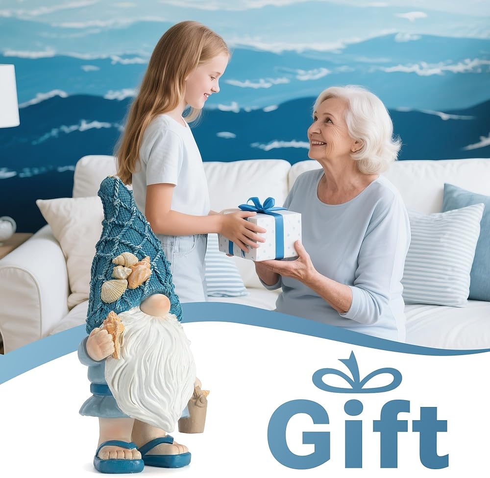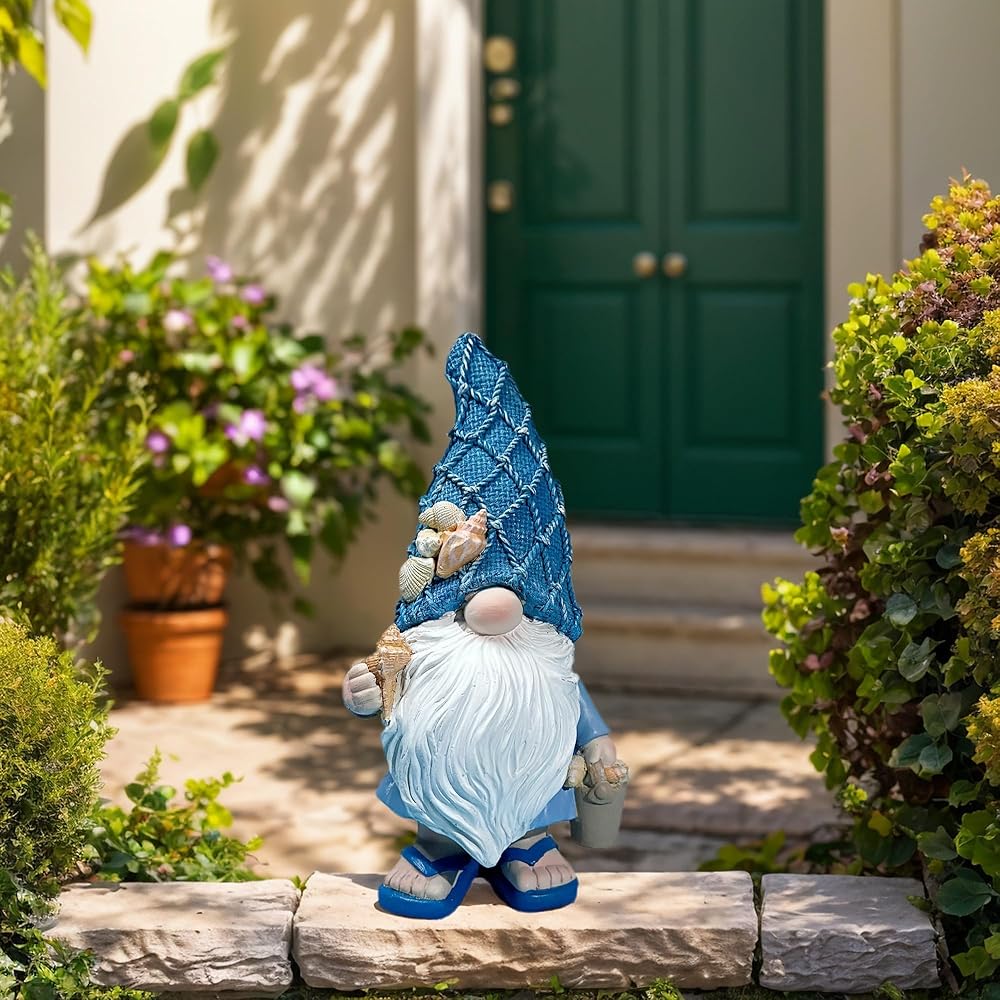UNIQUE DESIGN: The Ocean Gnome holds conch shells and starfish in both hands. From the sky blue textured hat to the light blue summer body, it features shells, starfish and waves. Symbolizes courage and freedom!