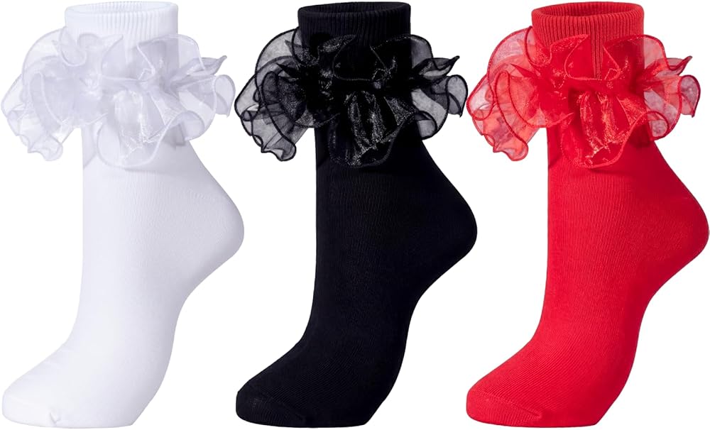 Oversized two-layer ruffled lace socks: Women lace socks are made of soft lace fabrics, double-layer laces, Lace with exquisite patterns, Make it easier for you to match special occasion dresses, and mary jane shoes…