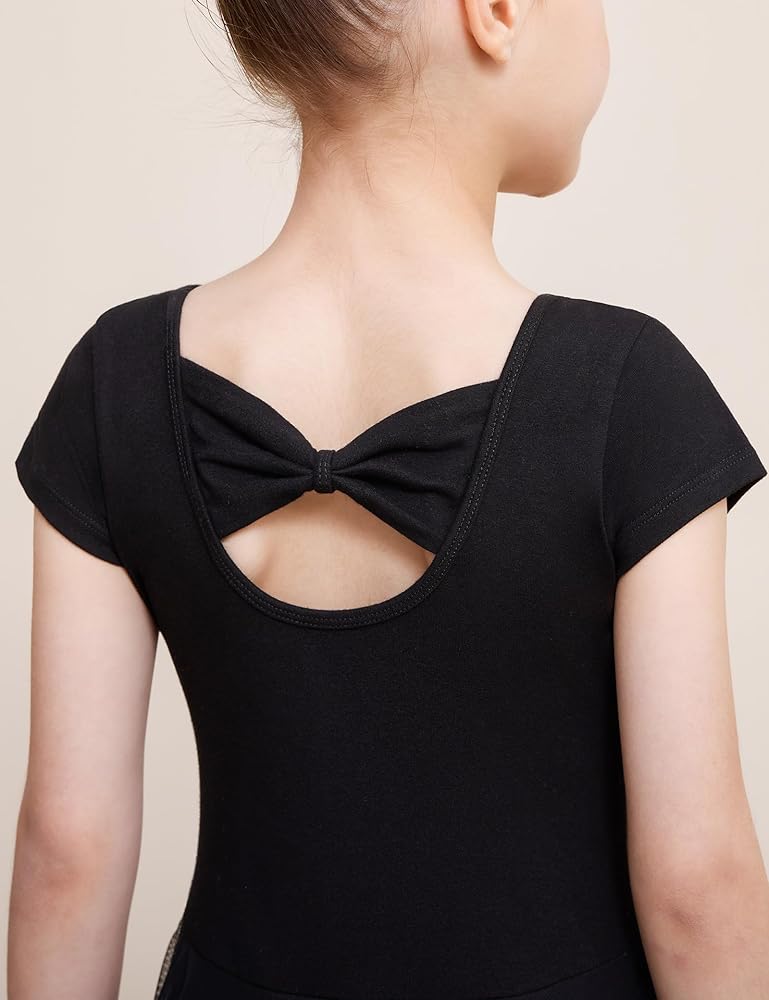 Elegant Back Collar Bow Design:Features a delicate bow securely stitched to the back collar, adding stage-ready flair without dangling risks—perfectly sized for young dancers' proportions.