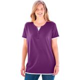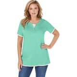 Experience ultimate comfort with our Layered-Look Tee, featuring an easy short-sleeve design perfect for everyday wear. Unique faux-layered visual detail adds a stylish, curated touch without the fuss of actual layers. The button-trim Henley neckline with inset offers a versatile look, making it great for casual outings. Crafted from a breathable cotton/poly blend, it provides a soft and comfortable feel. 28" length ensures a flattering fit that offers ample coverage, ideal for pairing with your favorite jeans. Machine washable for easy care, making it a practical addition to your wardrobe. Imported