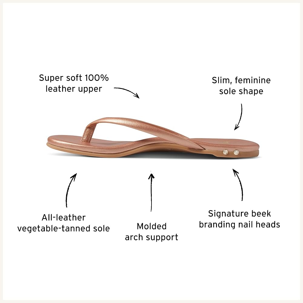 SOFT LEATHER MATERIAL: Features a leather-wrapped memory foam sole, thin leather-wrapped straps for comfort, molded arch for added support, rubber outsole for enhanced grip and two metal studs at the inside of sole - our classic beek branding.