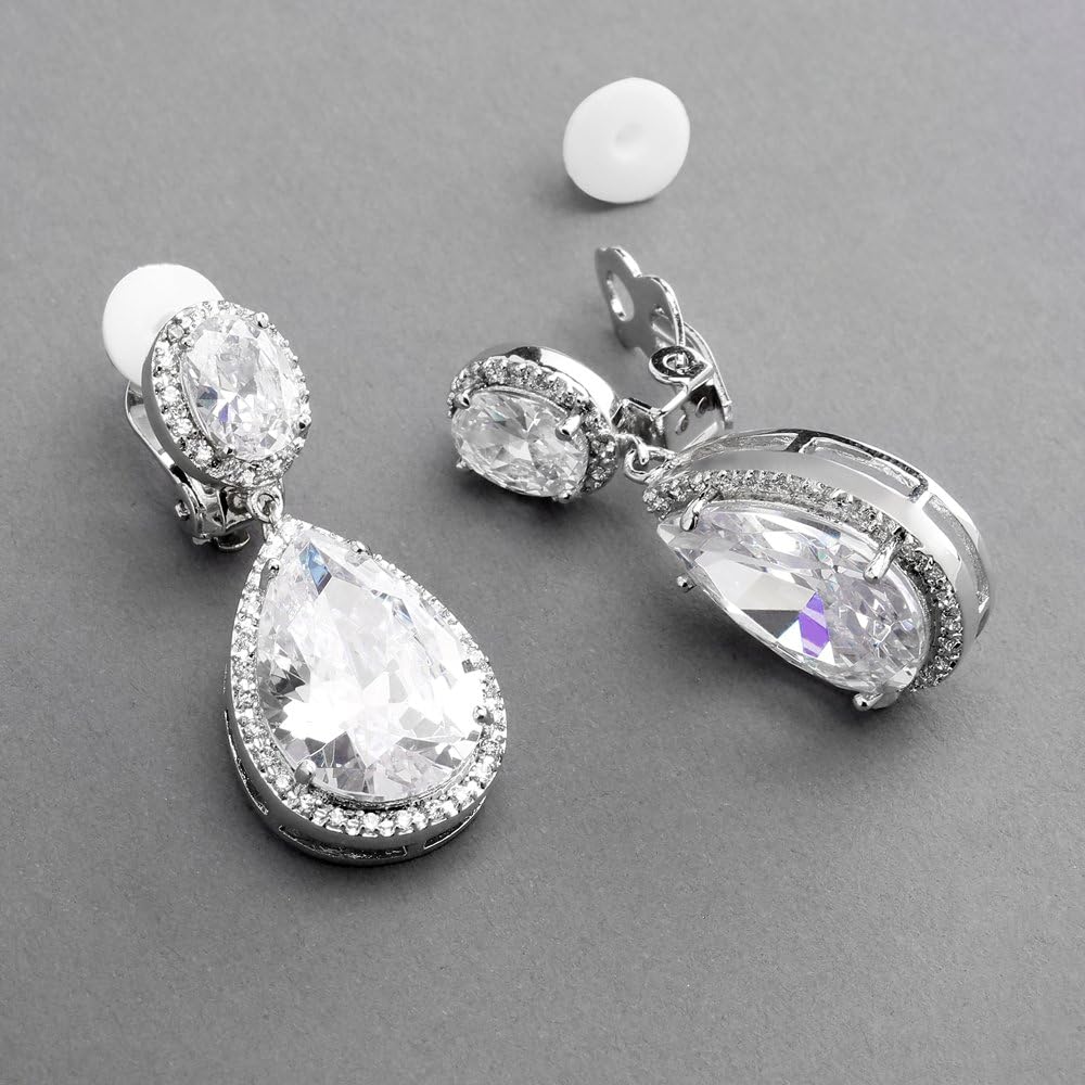 All eyes will be on you as you make your grand entrance wearing these stunning Cubic Zirconia designer earrings available in Genuine Silver rhodium platinum, 14K gold or 14 Karat rose gold plating with your choice of Pierced or Clip On style backs. Right off the couture runway, these top-selling dangles are the perfect accessory for your wedding or bridal gown, cocktail dress or any special occasion frock. With their gorgeous silver finish and gleaming quality gemstones, these earrings are guaranteed to turn heads everywhere you go! Add these bridal and wedding earrings to your jewelry collection and enjoy them for years to come. Complete the look with the elegant coordinating accessory Mariell Designs style 2074N sold separately. Treat yourself to some seriously glamourous sparkle!