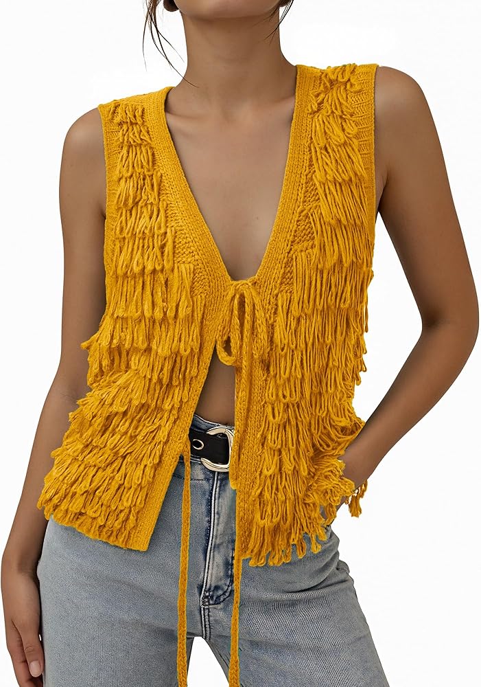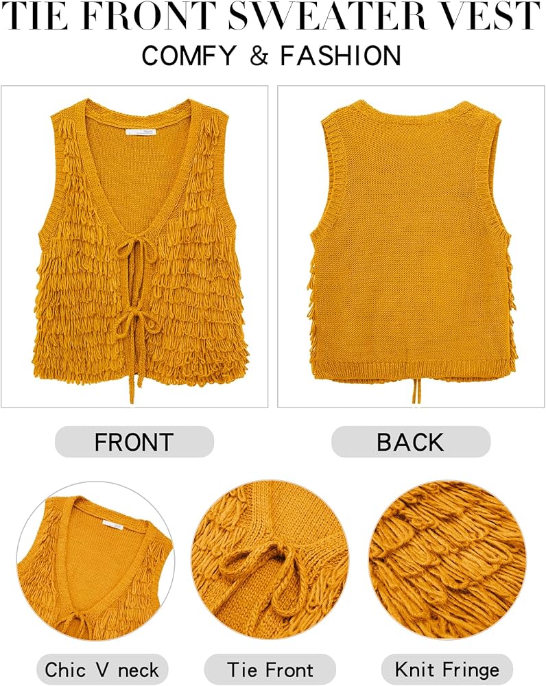 【Trendy Knitted Fringe】The biggest highlight of the summer vest is the dainty tassel elements, which showcase the romantic boho style and adds texture to the overall design. With flowing fabric and loose silhouette the tie front vest is drape naturally to hide a tummy perfectly.