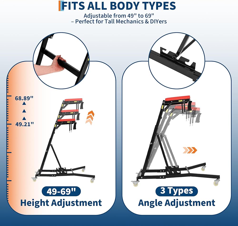 Adjustable Length & Angle for Versatile Repairs ✔ 9-Stage Height Adjustment (49.2"-68.9") – Fits mechanics of all sizes, perfect for trucks or low-profile cars. ✔ 3-Angle Options – Reduce back strain by customizing the tilt for engine bay or undercarriage work.