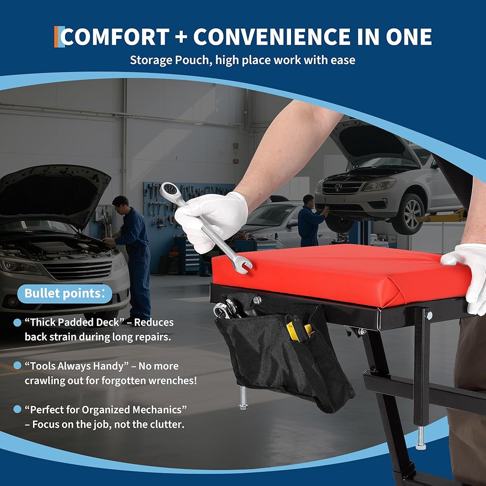 Thickened Cushion & Tool Storage for Comfort ✔ 2-Inch High-Density Padding – Wide 15"x16" cushioned deck supports prolonged use without fatigue. ✔ Built-in Tool Pouch – Keep wrenches, screws, or gloves within easy reach for efficiency.