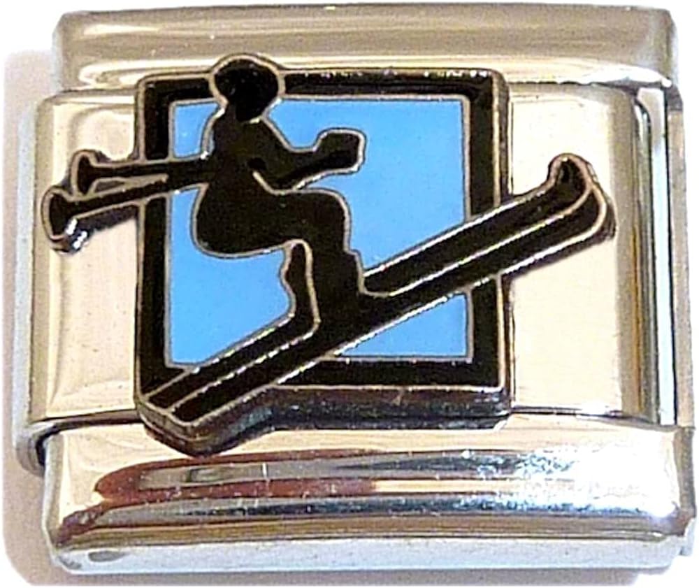 Skiing Blue Italian Charm. This hiqh quality Italian Charm is compatible with our entire Italian Charm line as well as with all other major brands. Start with a few unique designs and build up to a full bracelet of unique charms over time. These charms and the bracelets they create make great gifts for a birthday, graduation, Mother's Day, and more.