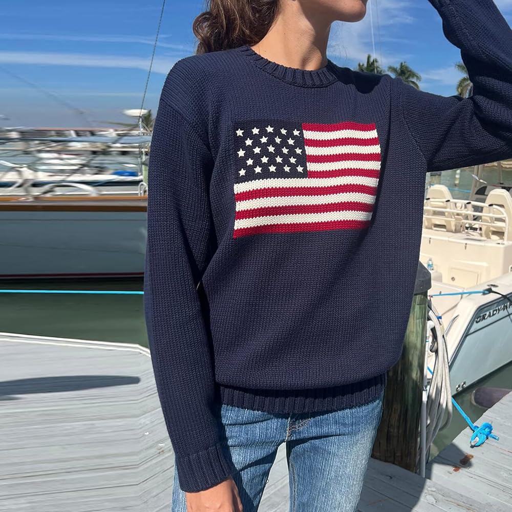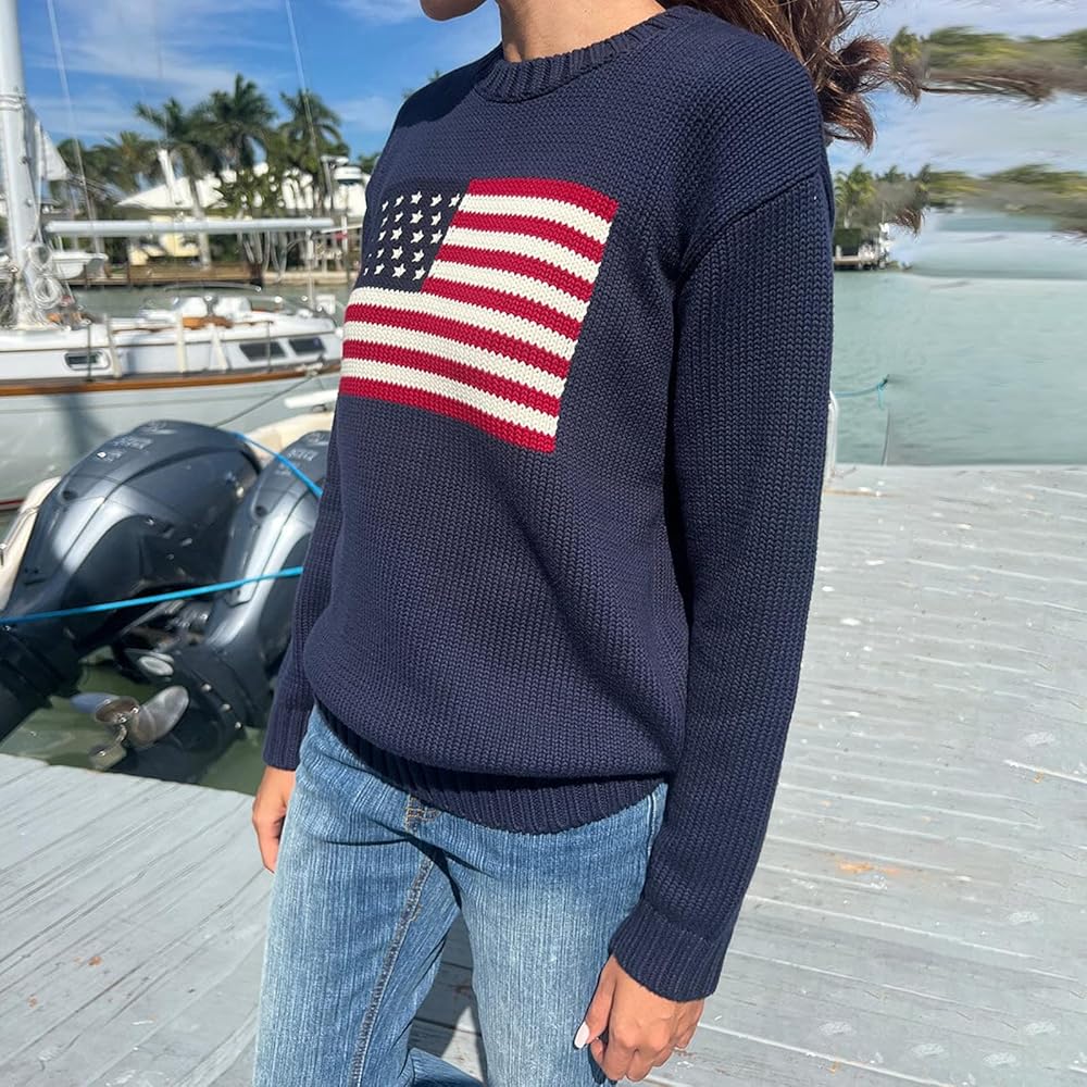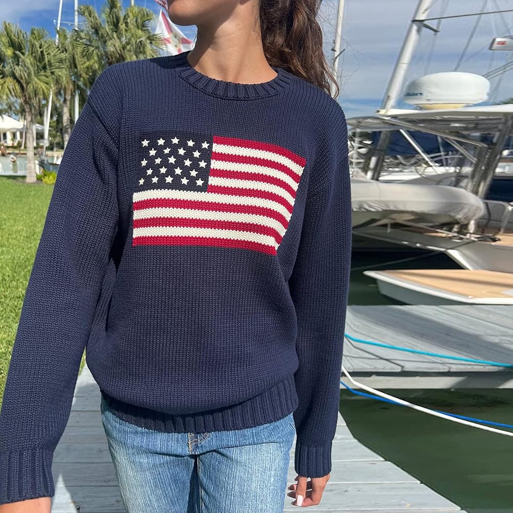 • Material: Polyester blend. Women flag sweater made by quality fabric. Lightweight, breathable, skin-friendly, patriotic shirts for women, knit American flag pullover top, women's flag pattern long sleeve round neck sweaters, loose fit, 4th of July Outfits for women.
