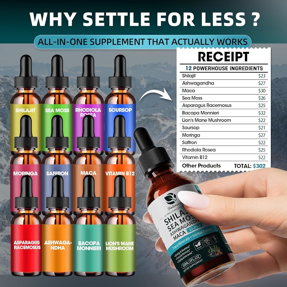 Trace Minerals Liquid Droppers: Unlike basic Sea Moss supplements, unlock ancient wisdom with Shilajit, Ashwagandha, and Maca paired with Saffron, Rhodiola, and Moringa—a science-backed blend for endurance, mood balance, and overall vitality.