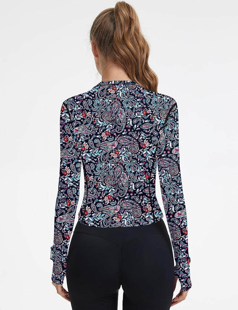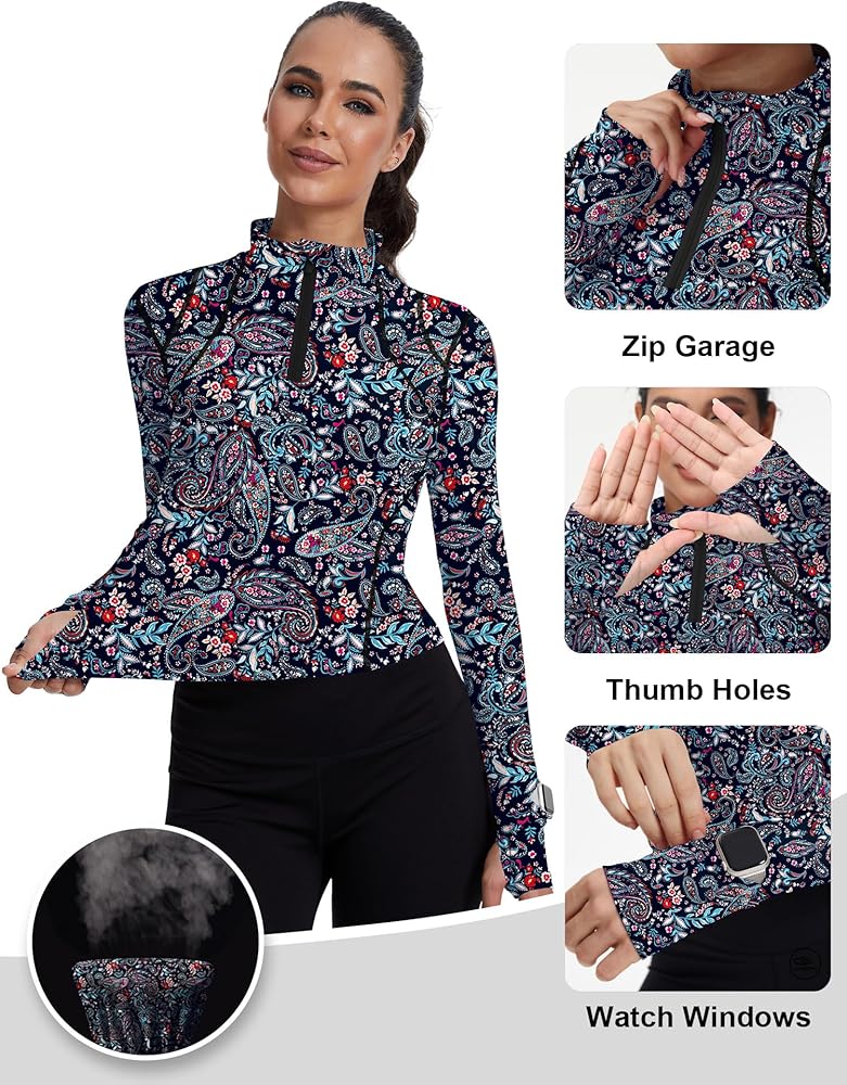 [Design]: 1)The running Top has 2 hidden watch windows on the wrist, allowing you to easily check the time or fitness tracker while exercising without having to pull down the thumb holes. 2)Zipper garage at neckband to keep you away from chafing.3)Thumb holes can prevent the cuff from slipping back during exercise, also protect your palms.