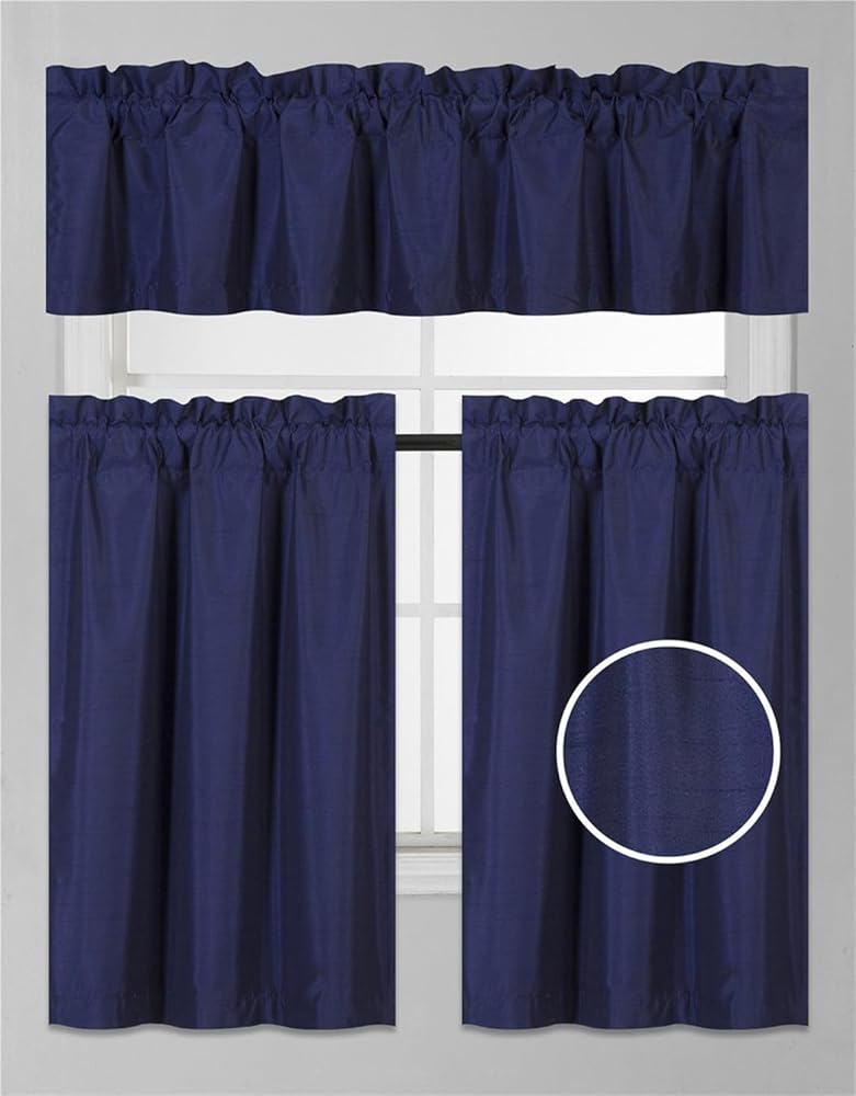 3-Piece Set Includes: 1 Faux Silk Valance with Foam Backing Size 60" Wide X 14" Long 2 Faux Silk Tiers Panel with Foam Backing Size 30" Wide X 36" Long (Each Tier) Decorate your kitchen area with this blackout Window Treatment, Keep your kitchen looking classically chic with these solid curtains. The lined window curtain tiers set add style to your windows and match any kitchen decor you have and quickly enhance any room. Perfect for your kitchen or any Dining ,Garage, Hallway ,Laundry window with this be autiful house warming curtain set Made with 100% polyester .