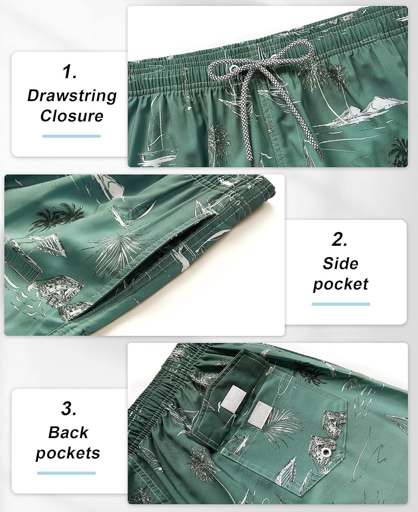【Multiple Pockets】:The swim Trunks with Compression Liner get 4 pockets,2 side mesh deep large pockets, 1 back flap velcro drain hole pocket on the back of swimwear and 1 inner compression shorts pocket, they can storage small things like phone, keys, cards.