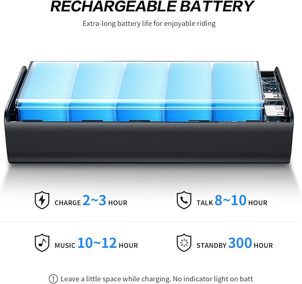 Bluetooth modular motorcycle helmet with 500mah battery allow you to talk and listen to music for 8-10 hours with single charge and 300 hours standby. Just note that the battery will enter deep sleep if no use for long time. Charge it at least 1 time a month, and follow the steps to wake it up if happens: 1. Use standard 5V 1A charger to charge it 0.5h. 2. Unplug it. 3. Charge again for 2-3h. To protect battery, we don't suggest you to charge it over night ( No indicator light on battery)
