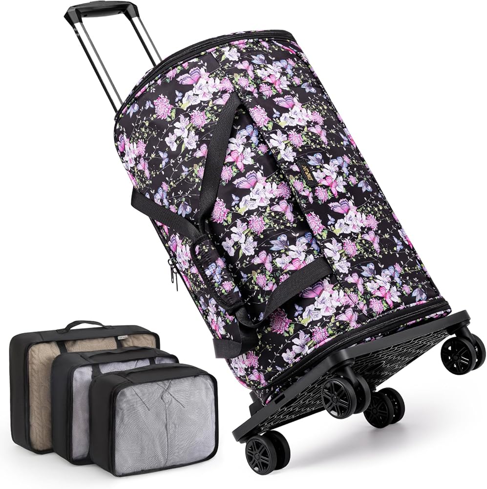 4Pcs set travel garment bag combo: Duffel bag dimension: 21"L*11"W*11.5"H, foldable garment bag dimension: 40"L*21"W, can hold all your travel essentials. Equipped with 3 set packaging cubes of different sizes, L: 16*12.5*4.8", M: 13.3*10.6*4.3", S: 12.3*9.3*4.3", keeping each item in an orderly manner to maximize the capacity. Detachable and upgradable widened floor rollers, featuring 4 360° rotating wheels and 3-section height adjustment (19.5-36") to meet your needs in different scenarios.
