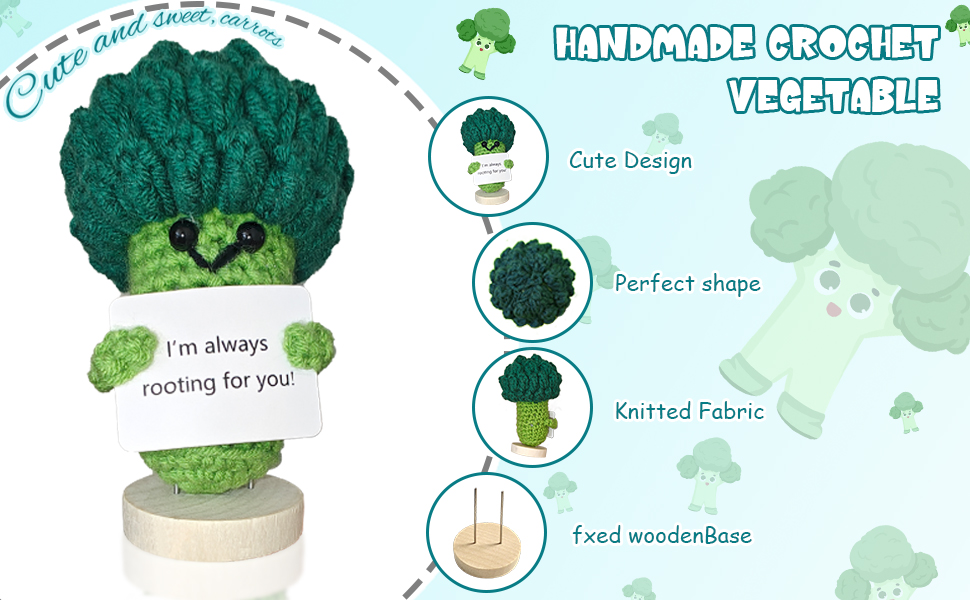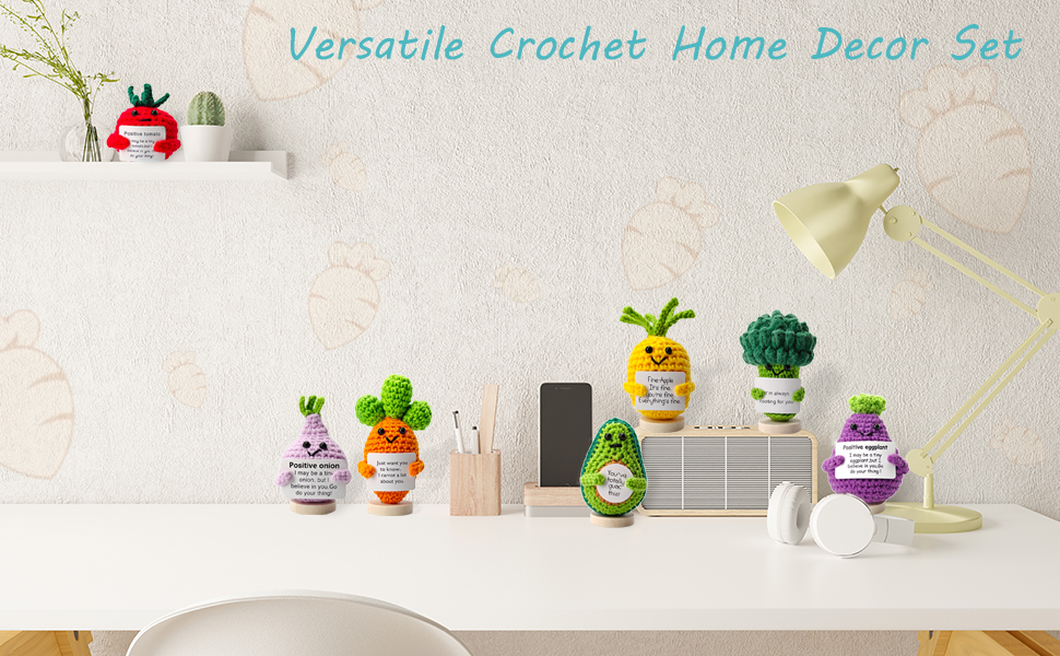 Charming Positive Crochet Collectibles: 7 piece crochet animals set, ultra cute and positive broccoli, fun and happy pineapple, sweet and comfortable eggplant, creamy and relax avocado, cheerful and motivate tomato, spicy and unique onion, orange and adorable carrot.These mini crochet animals can give you a positive reminder and strength of belief when you're feeling tough.
