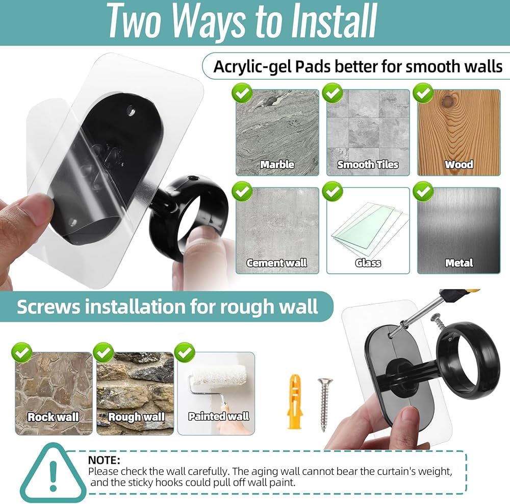 KIND TIPS: No screws, no drilling, no wall damage. No drill curtain rod brackets are best for smooth surfaces like tiles, glass, wood, and metal. For rough surfaces like drywall, painted walls, or wallpaper, use screws to install ceiling mounted curtain hooks. Important: Check wall condition—aging walls may not support curtains. Sticky hooks are very adhesive but may pull off with wall powder