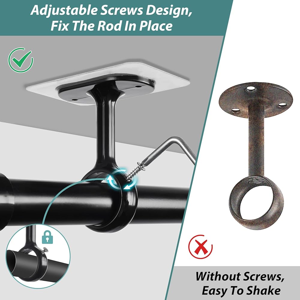 【Compatible Rod Size】Our curtain hangers no drilling fit most curtain and towel rods with diameters of 0.8'' to 1.24''. The curtain rod bracket no drilling with adjustable screws keeps the rod steady, avoiding wobbling while opening and closing curtains