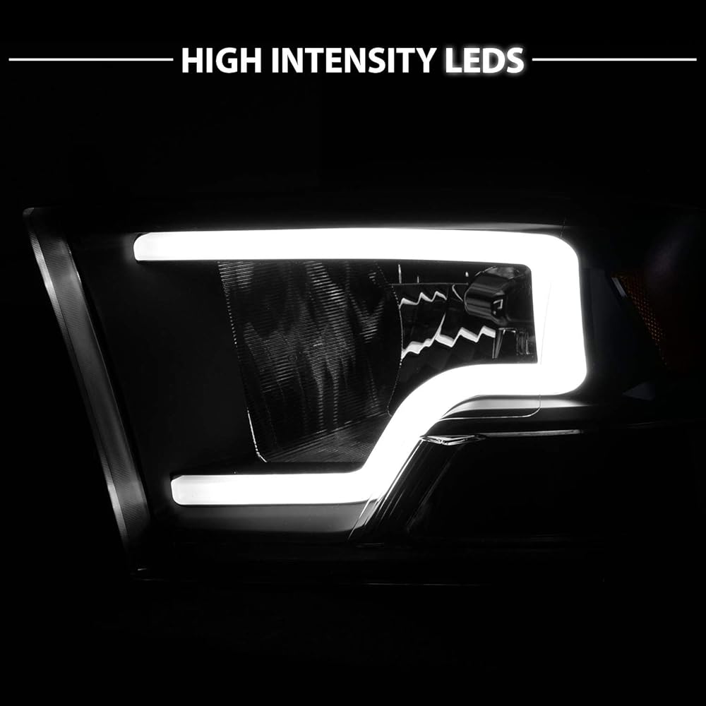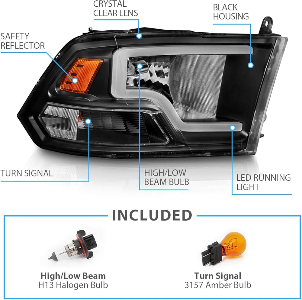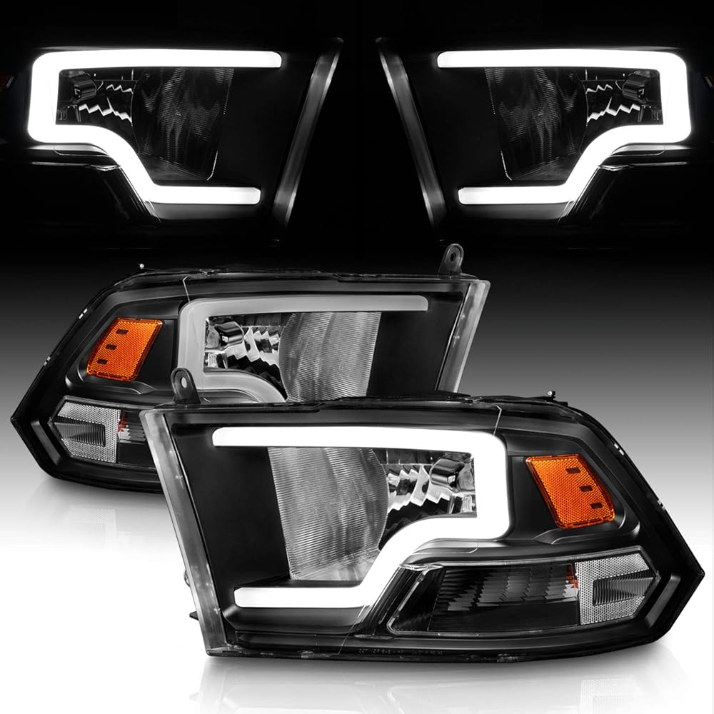 AmeriLite Black Replacement Headlights for 2009-2018 Dodge Ram 1500 2500 3500 Truck - LED Bar, with Bulbs, Driver and Passenger Side Pair