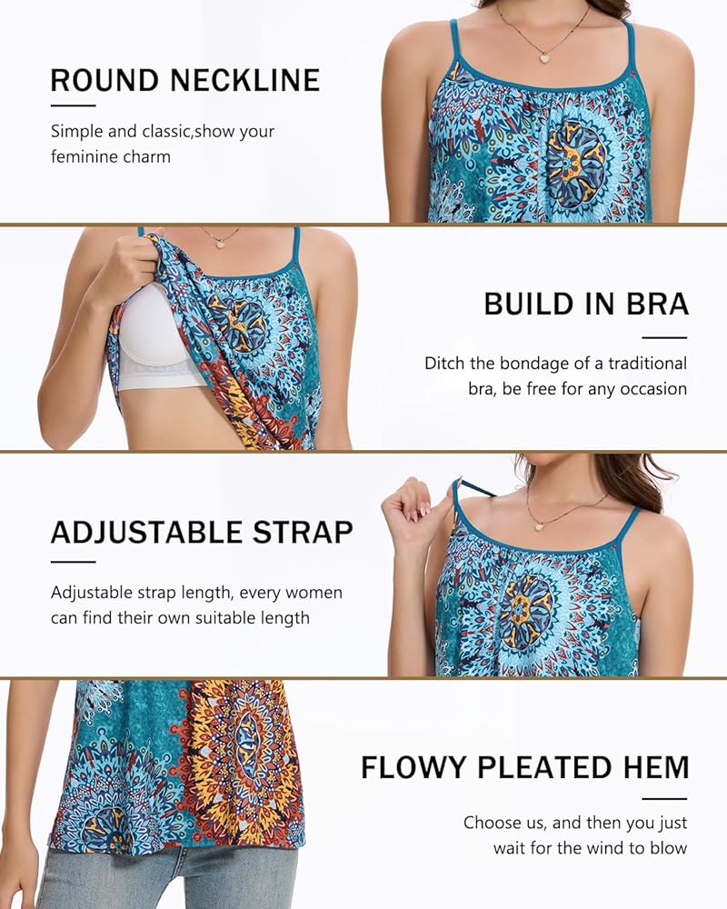 ✿Material:This camisole for women with built in bra is made of 95% Modal 5% Spandex(solid color);94% Polyester 6% Spandex(printed color),this material of the loose fit tanks provides you a comfortable, breathable, skin-friendly wearing experience.