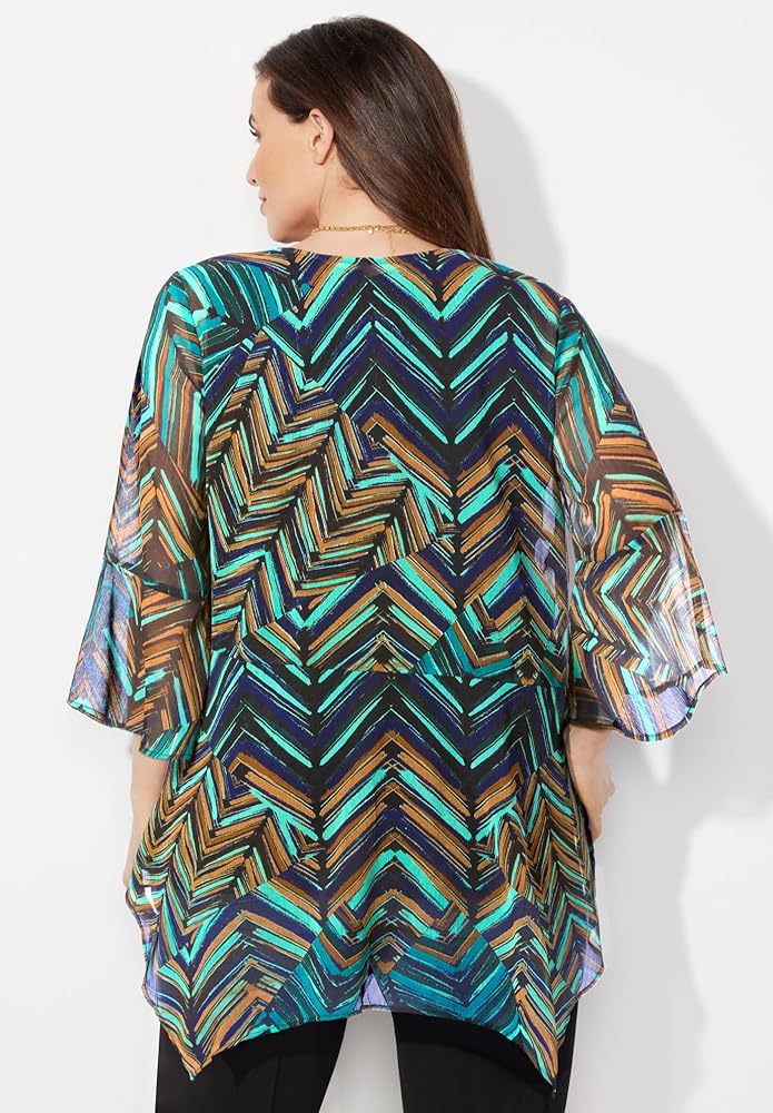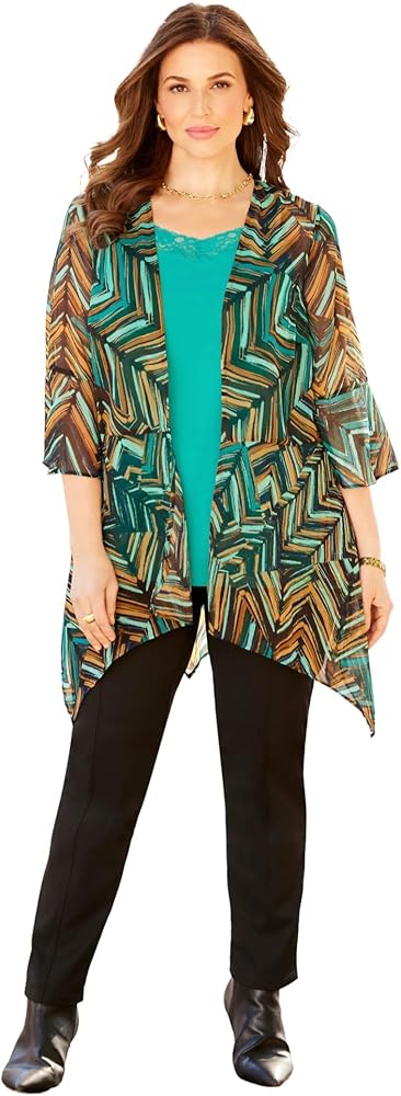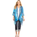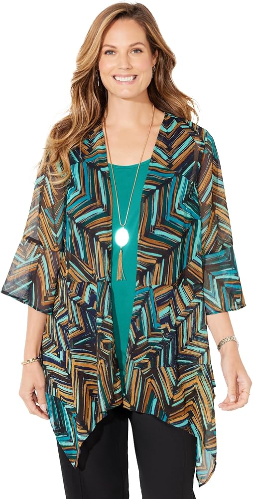 Our soft, crinkle-textured cascade wrap is an easy, elevated layer to wear all year round. You'll love the way the airy fabric adds a layer of beauty without adding bulk. FABRIC: Crinkle chiffon fabric is airy, lightweight and cool to the touch. As a top layer, this fabric adds beauty and texture to any outfit. FIT: Relaxed and easy with a soft, flowy look and feel. Bust darts for shaping. Open cascade front. Flounce finish at the 3/4 sleeves and hem. 100% PolyesterMachine WashImported Plus Size TopFront Length (On Body): Regular 31”, Petite 29”Plus Sizes 0X–6X, Petite Plus Sizes 0XWP–3XWPCatherines