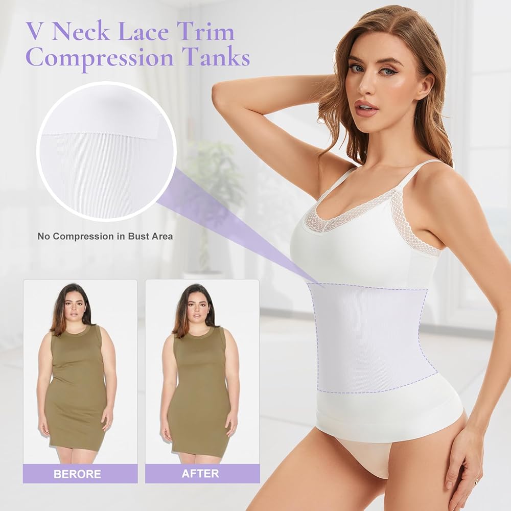 Reinventing Body Shaping:Our V neck lace trim compression tank tops for women will be your new BFF for everyday confidence! With medium-light compression that feels like a gentle hug, tummy control tank tops for women smooth out stubborn belly fat and define your waistline like magic. No more muffin top drama - the seamless body shaping tank tops create that "did-you-lose-weight?" silhouette under clothes. Perfect for anyone craving that hourglass vibe without feeling squeezed like a sausage.