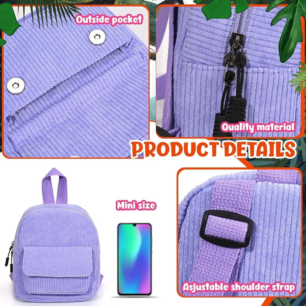 Mini Corduroy Backpack:the purple mini backpack made of corduroy material,measuring at a compact size of 7.5 x 9 x 3.5 inches/ 19 x 23 x 9 cm, Whether you need to store your phone, wallet, cards, cosmetics, or other small items for a Halloween cosplay party, this backpack can meet your needs.
