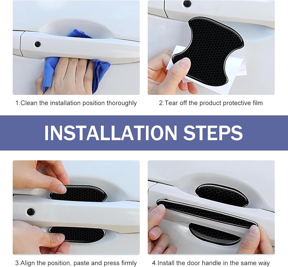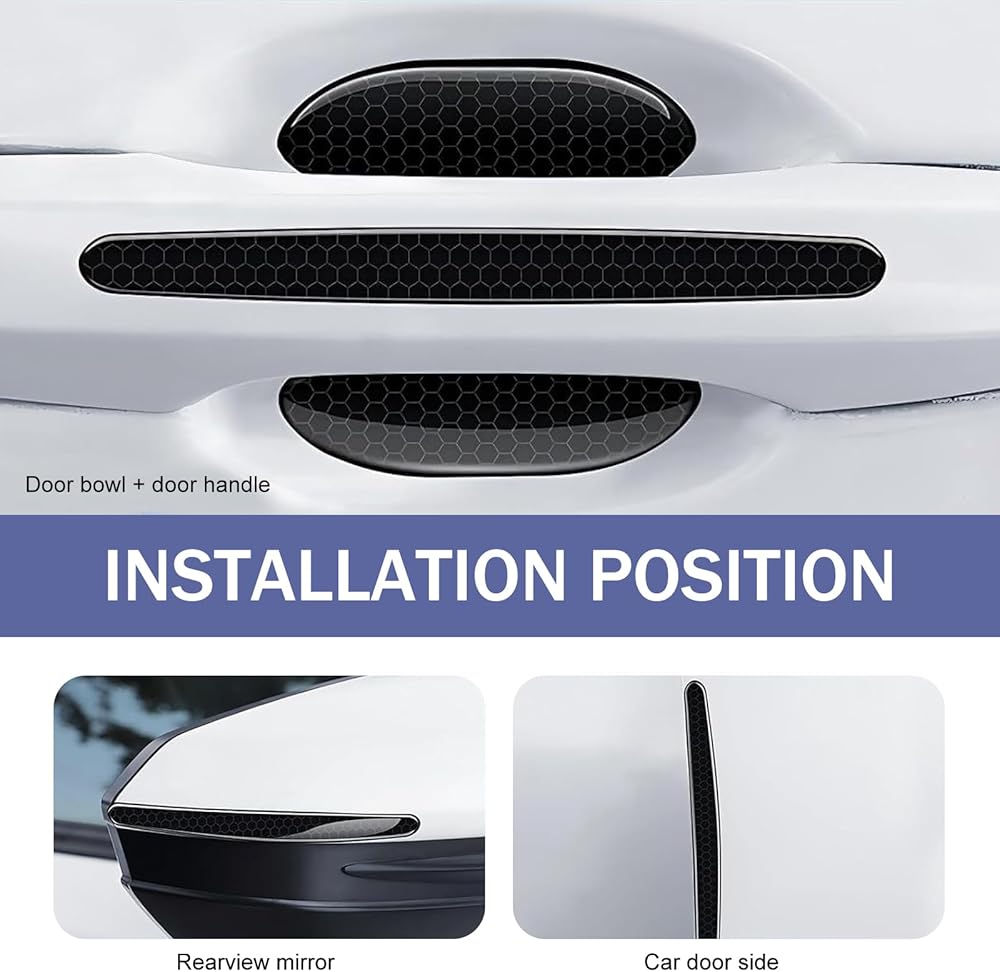 Compatible Design: The package includes four door handle stickers (5.8×0.6inches) and four door bowl stickers (3.15×3.15inches). Lightweight and compact, suitable for most SUVs and cars. Verify size and shape prior to installation for optimal fit.