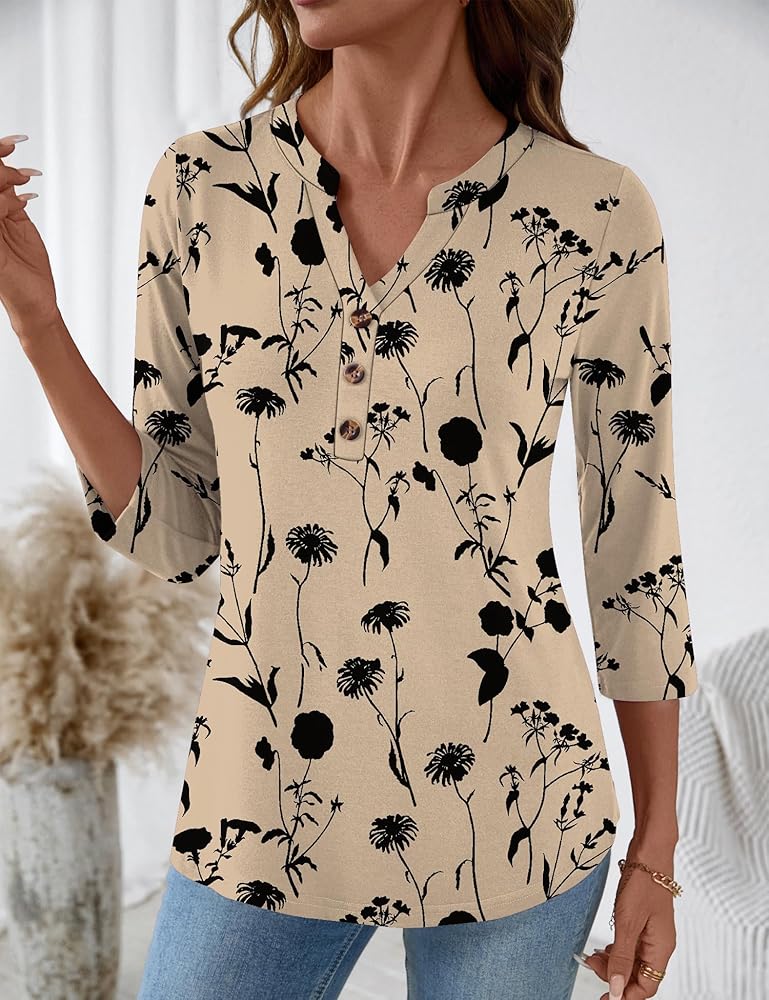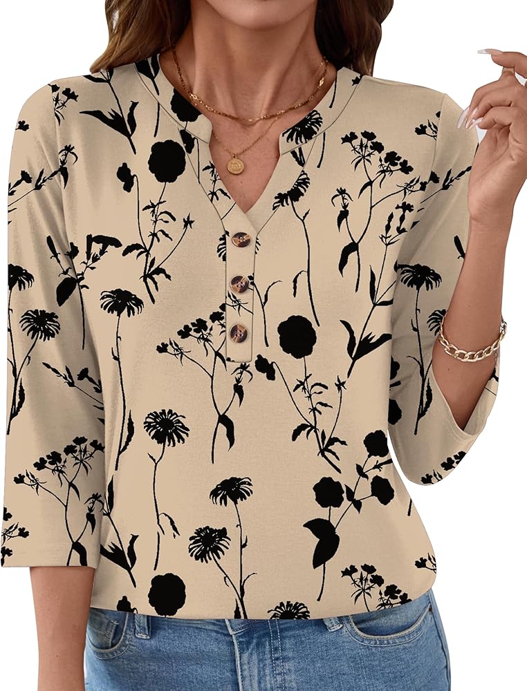【Great Features】: 3/4 length sleeve womens tops,womens shirts dressy casual,fall blouses for women business work,summer outfits for women,cute button details on neck,simple V neck with curved hemline