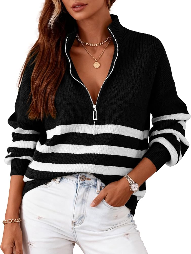 FASHION CHOOSE - The Pullover Jumper Features A Stand Collar For A Casual Cozy Style. Convenient Zipper On The V-Neckline Give The Women Pullover a Charm Delicacy. Simple But Elegant Striped Printed Is Never Out Of Date, Which Adds a Touch Of Classic And Romantic Vibe