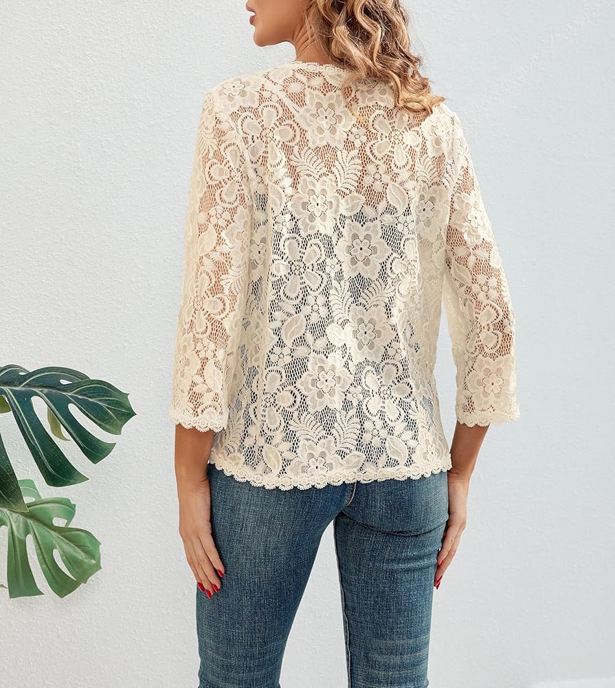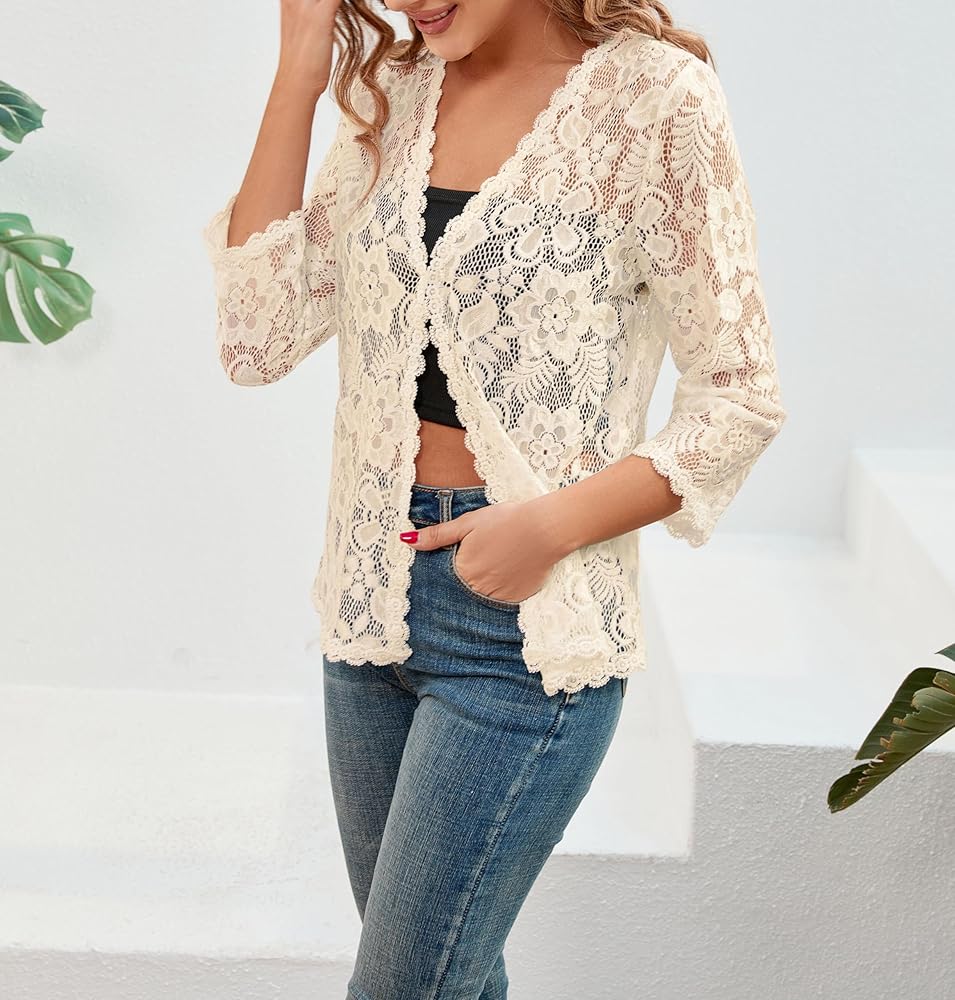 Match:This Trendy 3/4 sleeve mesh lace crop shrugs bolero top can be worn as sun-proof clothing, or over a bathing suit. Lightweight See through open front mesh lace shrugs jacket is easy to match with vest, tank tops,camisole,wedding dress, evening dress, tube top, bra, Bikini, sundresses, cami dress, skinny tshirt,and can be paired jeans, pants, shorts, skirts, legging in Spring, Summer and Fall