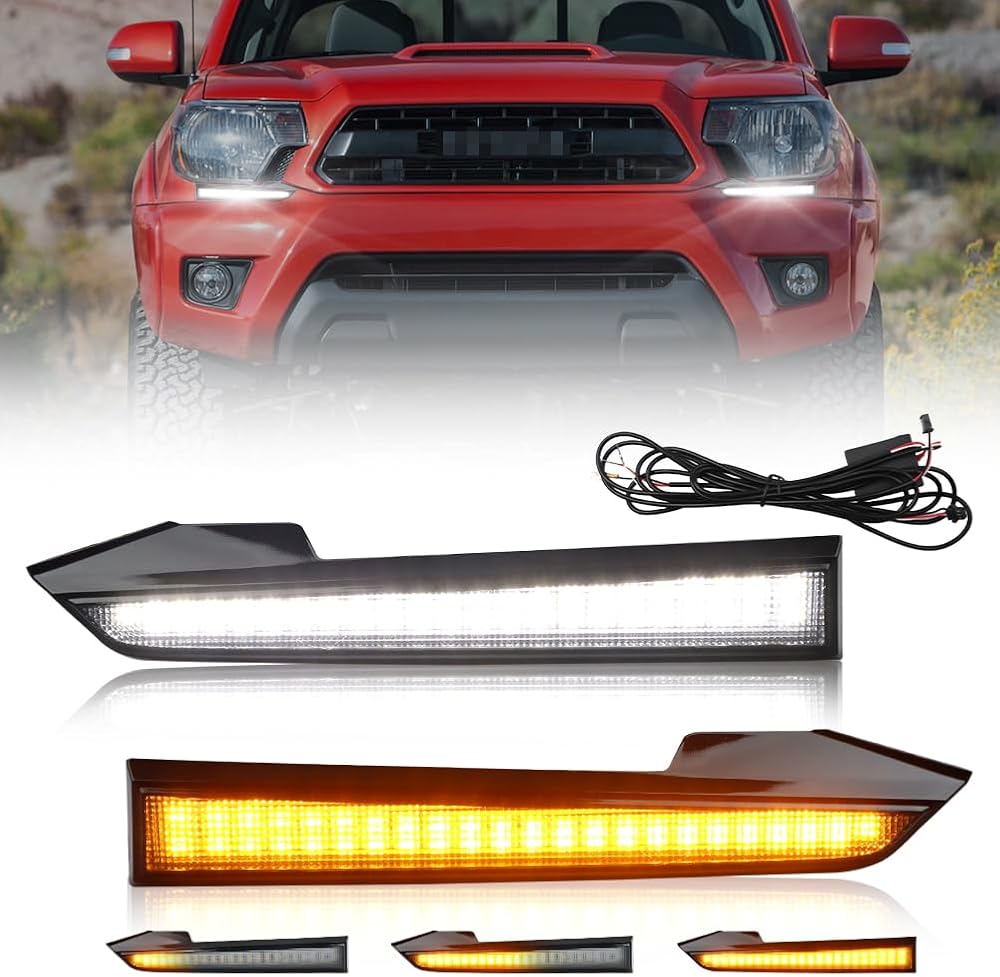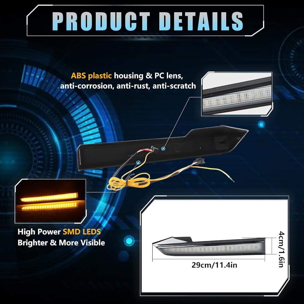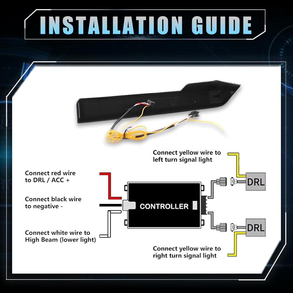 [Effortless Installation] Upgrade your vehicle easily with no drilling required. Replacing the original OEM Bumper Trim, it goes beyond by incorporating LED Daytime Running Lights that also serve as Amber Sequential Turn Signals. Installation is straight forward—connect the black wire to the negative (-), the white wire to High Beam (Low Light) (+), the red wire to DRL / ACC (+), and the yellow wire to the signal light (+).