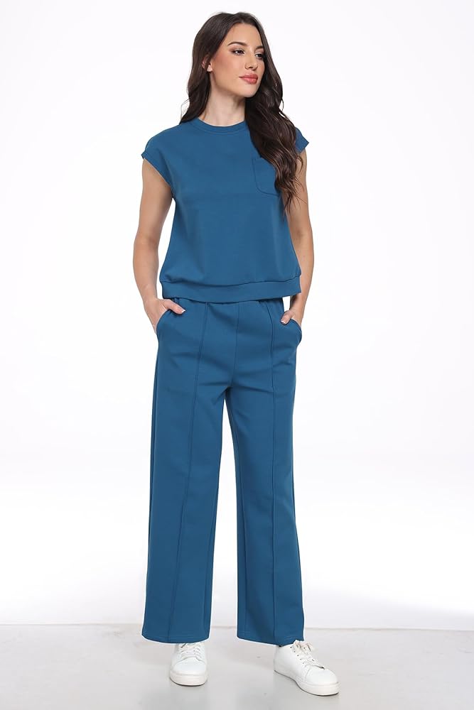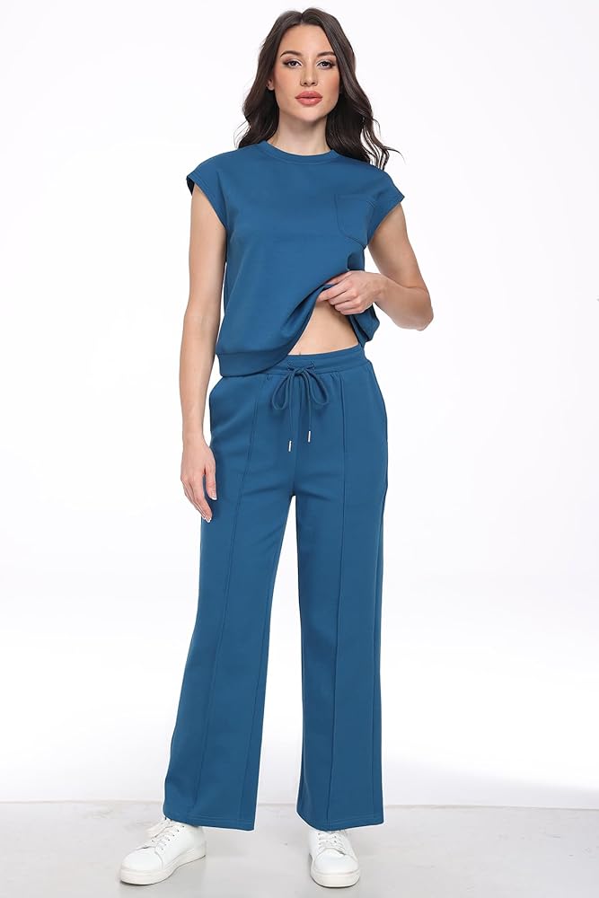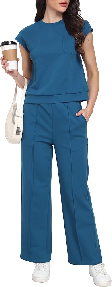𝐓𝐨𝐩𝐬: Basic crew neck/ short sleeve tops. This comfy tunic top is long enough to cover your hips,hide your belly.𝐏𝐚𝐧𝐭𝐬: Elastic waist drawstring pants/ wide leg sweatpants. Two convenient side pockets pants,help to hold your cellphone,keys,coins and lipsticks easily, stop worrying about where to put your phone while you are working/sporting