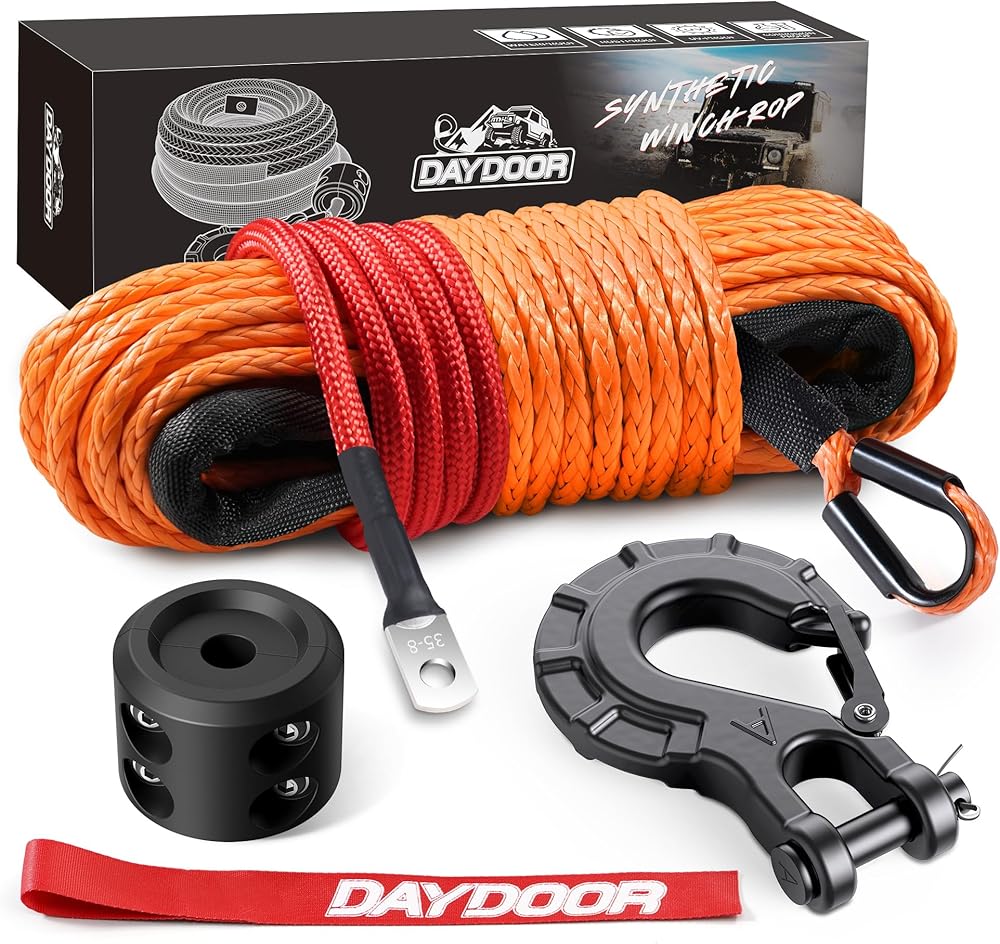 Heavy Duty Synthetic Winch Rope: Made from 12 strands braided ultra-high molecular weight polyethylene that is stronger than equivalent steel winch cable. Our 1/4'' x 50ft synthetic winch rope provides the max breaking strength of 10,000Lbs, are perfect for vehicles under 3200 Lbs