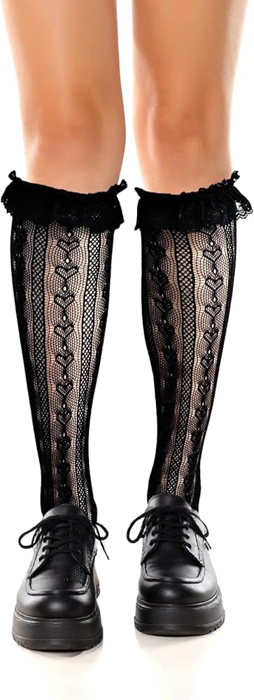 Lace Ruffle Fishnet Knee High Stocking Design: The funky lace ruffle coupled with cute heart patterns make the long tube fishnet knee high stockings more attractive, add not only a sense of fashion, but also cute experience to life, allowing you to show your unique personality and charm. Great Fit: The women girls lace knee high socks can be used as daily wear socks, lolita socks, dance socks, costume socks, party socks or holiday socks such as Halloween socks/ Valentine's Day socks/ Christmas socks/ Easter socks.